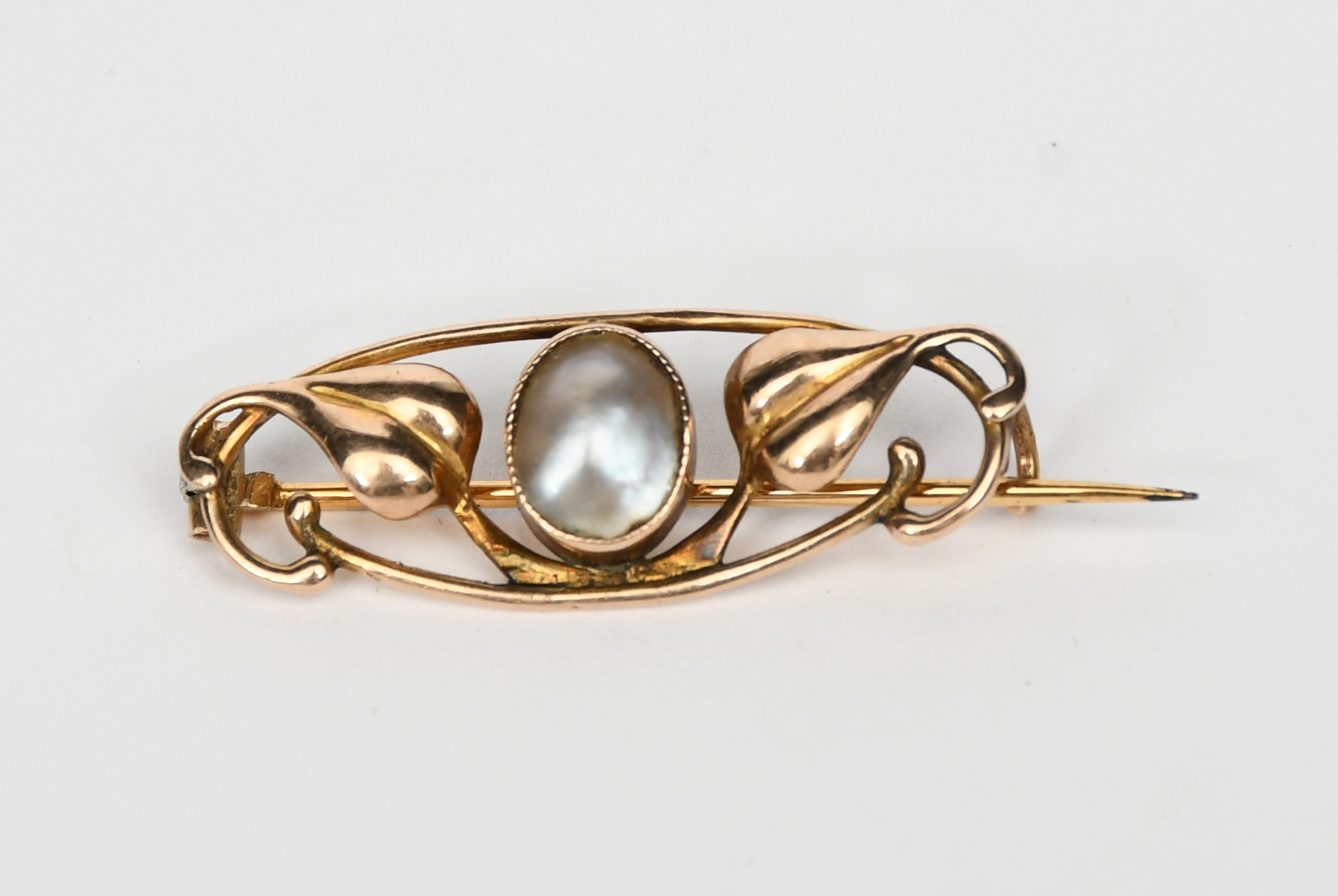 A yellow metal and mother of pearl brooch the design in the manner of Archibald Knox, cast with leaves flanking central polished mother of pearl cabochon, unmarked, 3cm wide