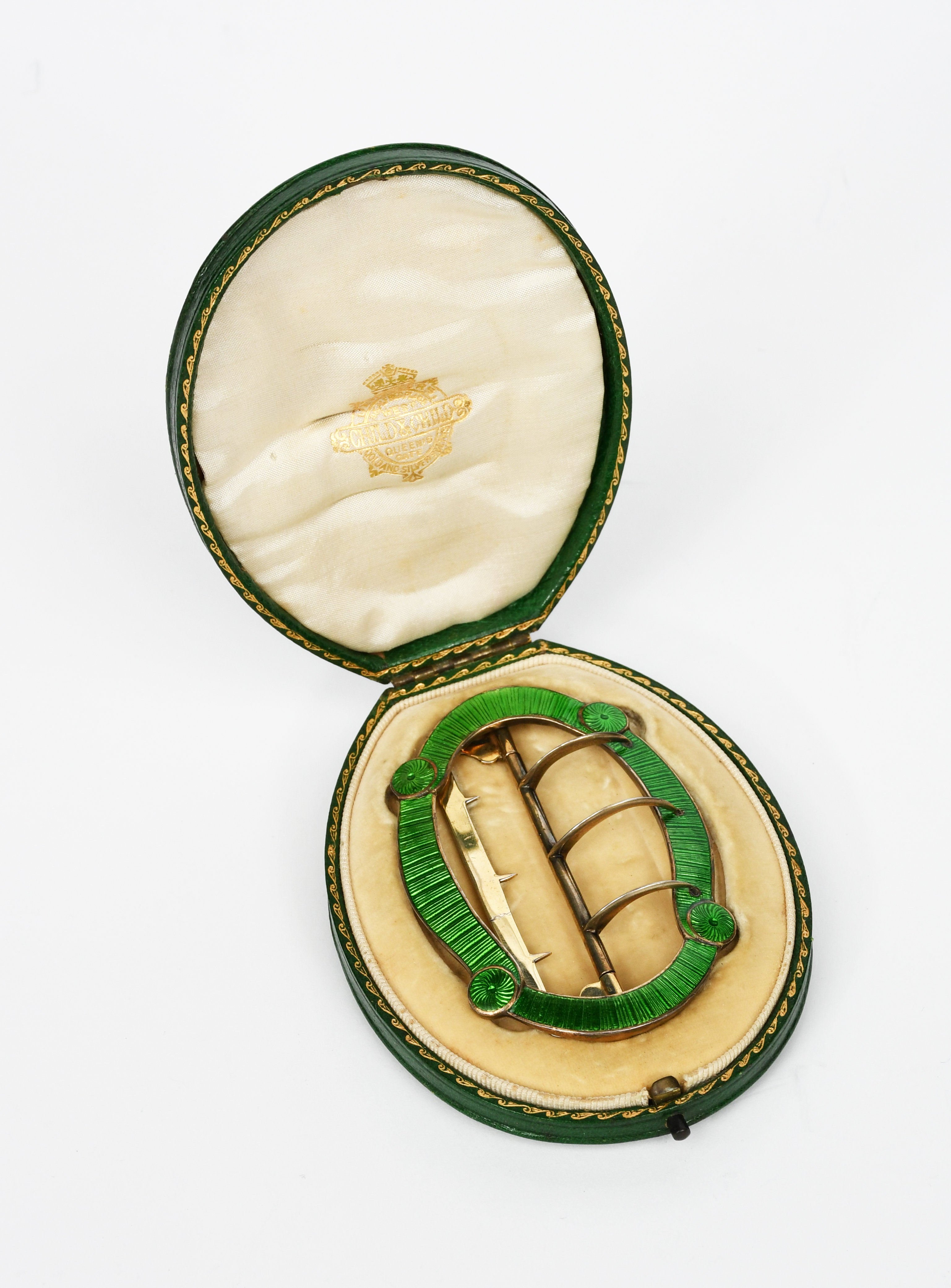 A Child and Child silver and green enamel buckle, in original presentation case, stamped marks, London 1901, 7.3cm. long