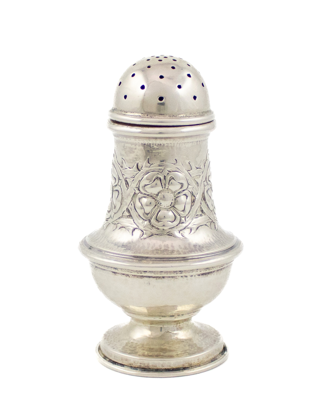 circular baluster form, spot-hammered decoration, embossed with Tudor roses over intertwined thorns, pierced pull-off cover, height 10.1cm, approx. weight 2.1oz.