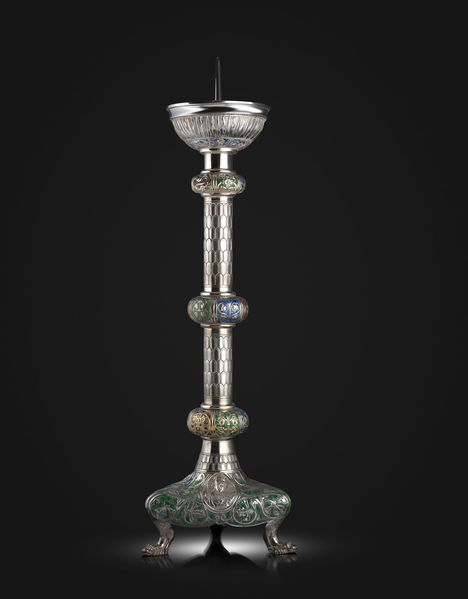 the cylindrical column with three knops, some traces of gilding, each with foliate decoration on green, red and blue enamel backgrounds, large circular tapering drip pan, with a central spike, on a raised triangular base with saint Irenaeus, Clement and Ignatius, and with blue, red and green enamel decoration, on three mask pad feet, the centre with a metal core, height 87cm.