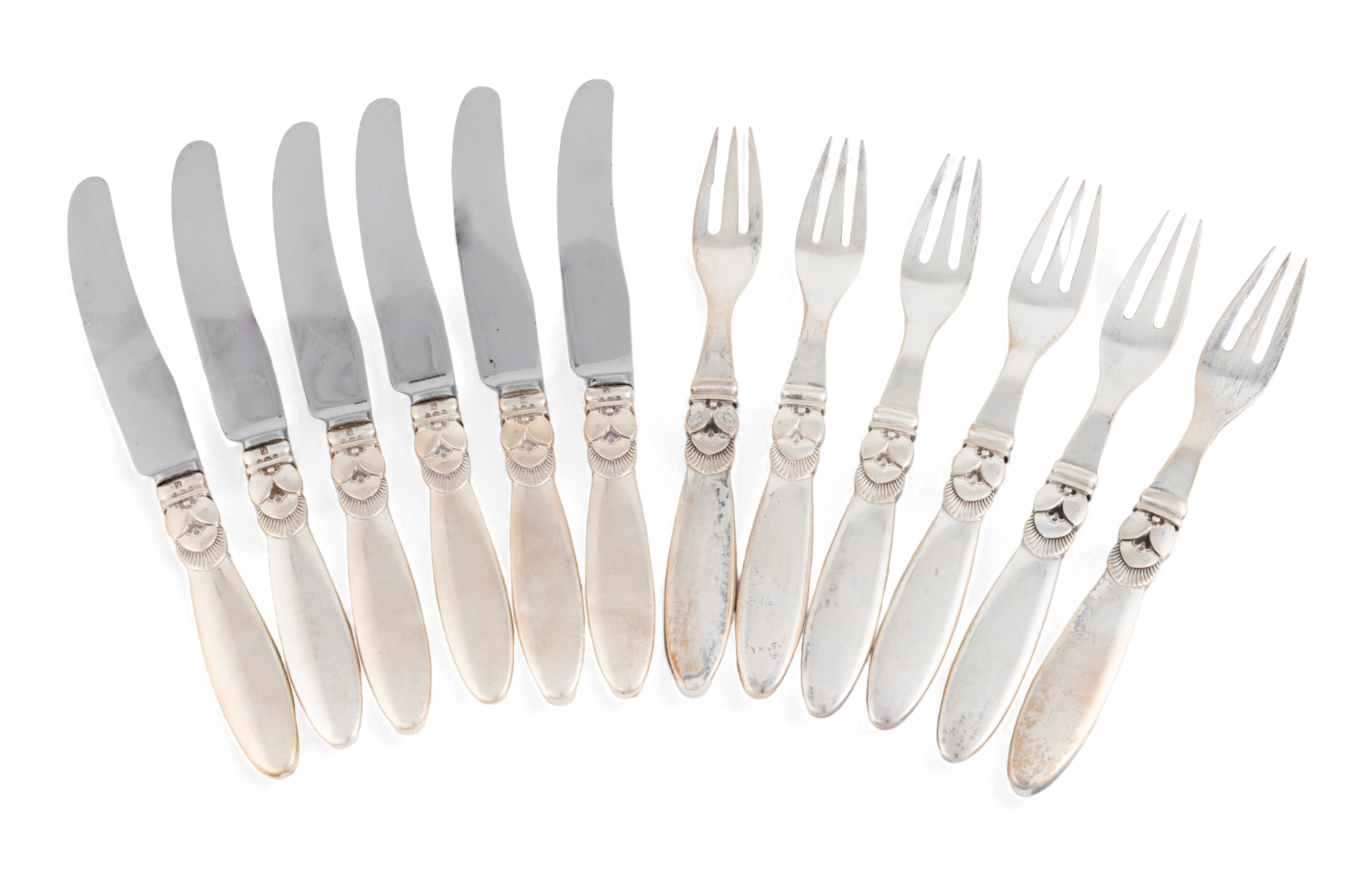 Designed by Gundorph Albertus for Georg Jensen, a set of six Danish silver Cactus pattern fruit knives and forks,