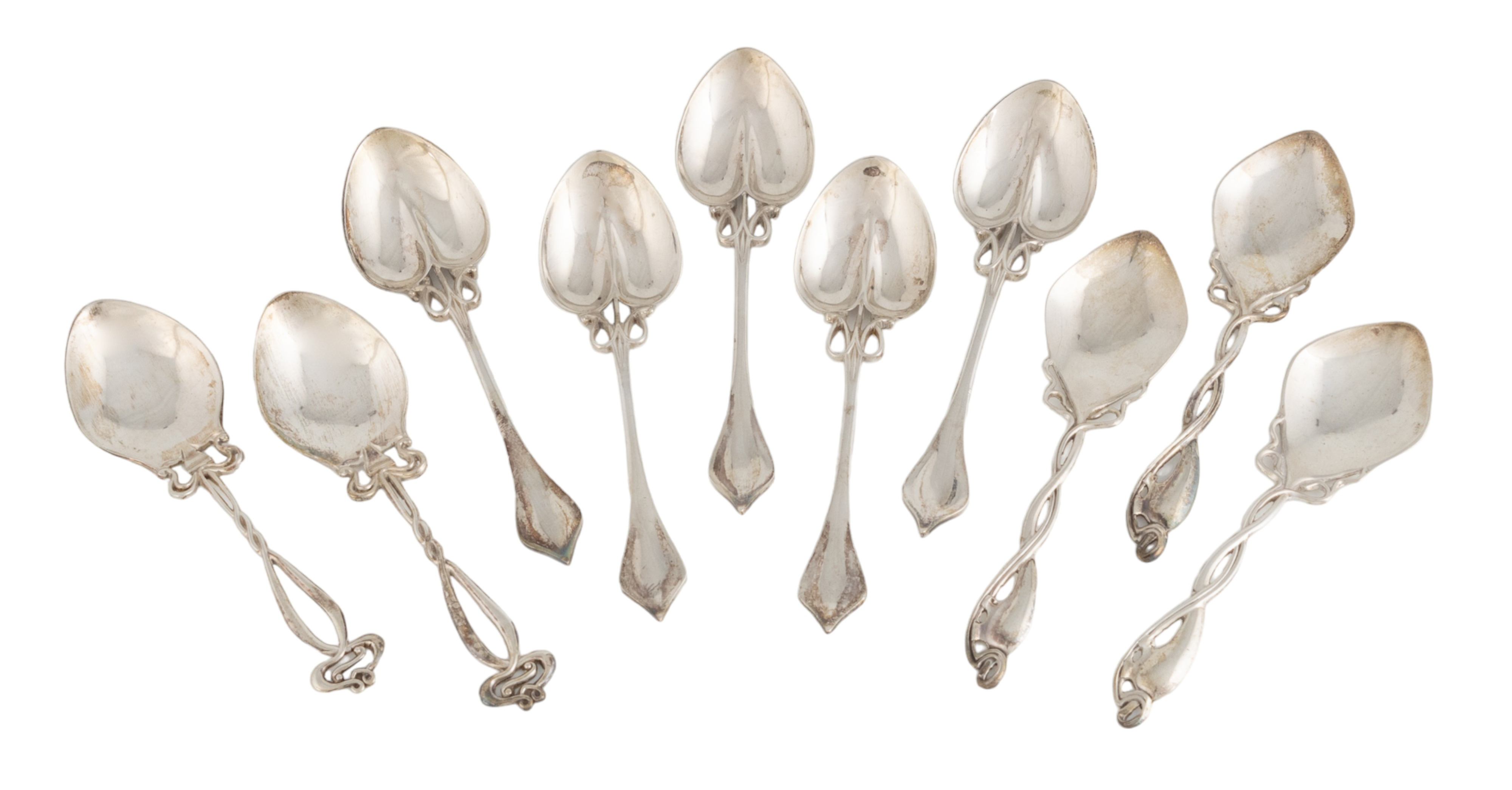 heart-shaped bowls with a tapering pierced stem and shaped terminal, length 10.8cm, plus a set of three late-Victorian silver Art Nouveau teaspoons by Hulkin & Heath, Birmingham 1900, and another pair of late-Victorian silver Art Nouveau teaspoons, in two fitted felt cases, total approx. weight 4.9oz. (10)