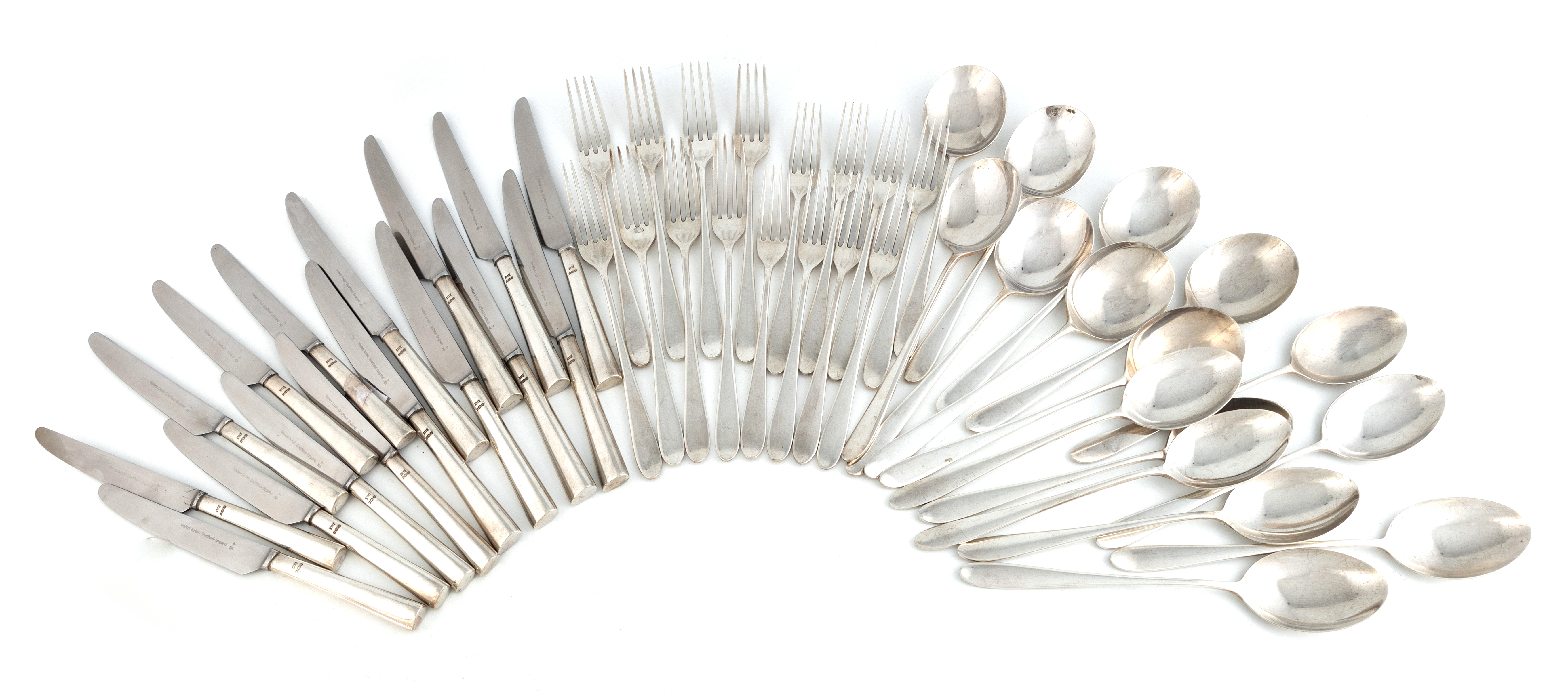 comprising: eight soup spoons, eight dessert spoons, eight table forks, eight dessert forks, eight silver-handled table knives and eight silver-handled dessert knives, total approx. weighable 51oz. (48)