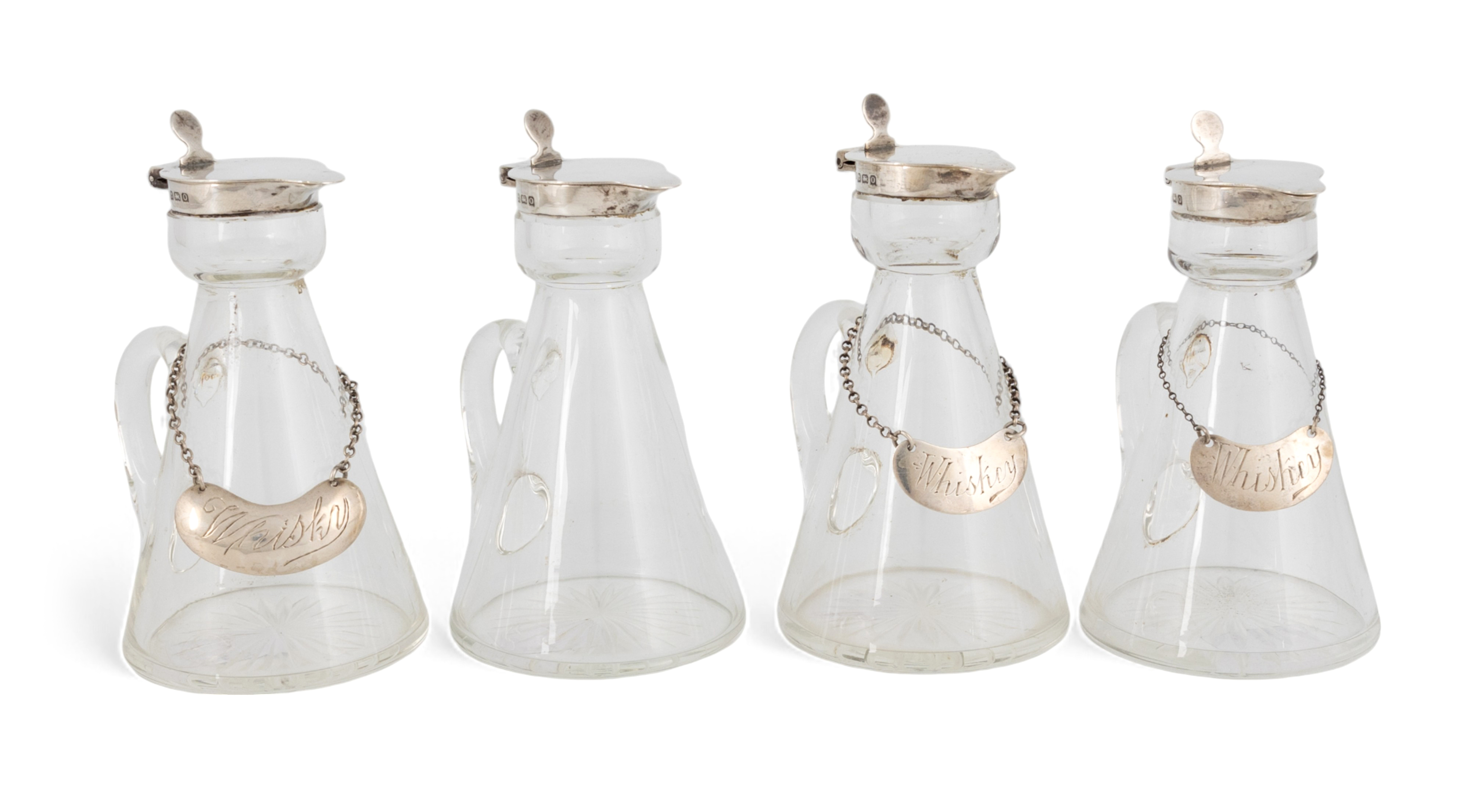 tapering form, scroll handles, plain hinged covers, plus three silver labels, two engraved 'whiskey' and one 'whisky', height 11.8cm. (7)