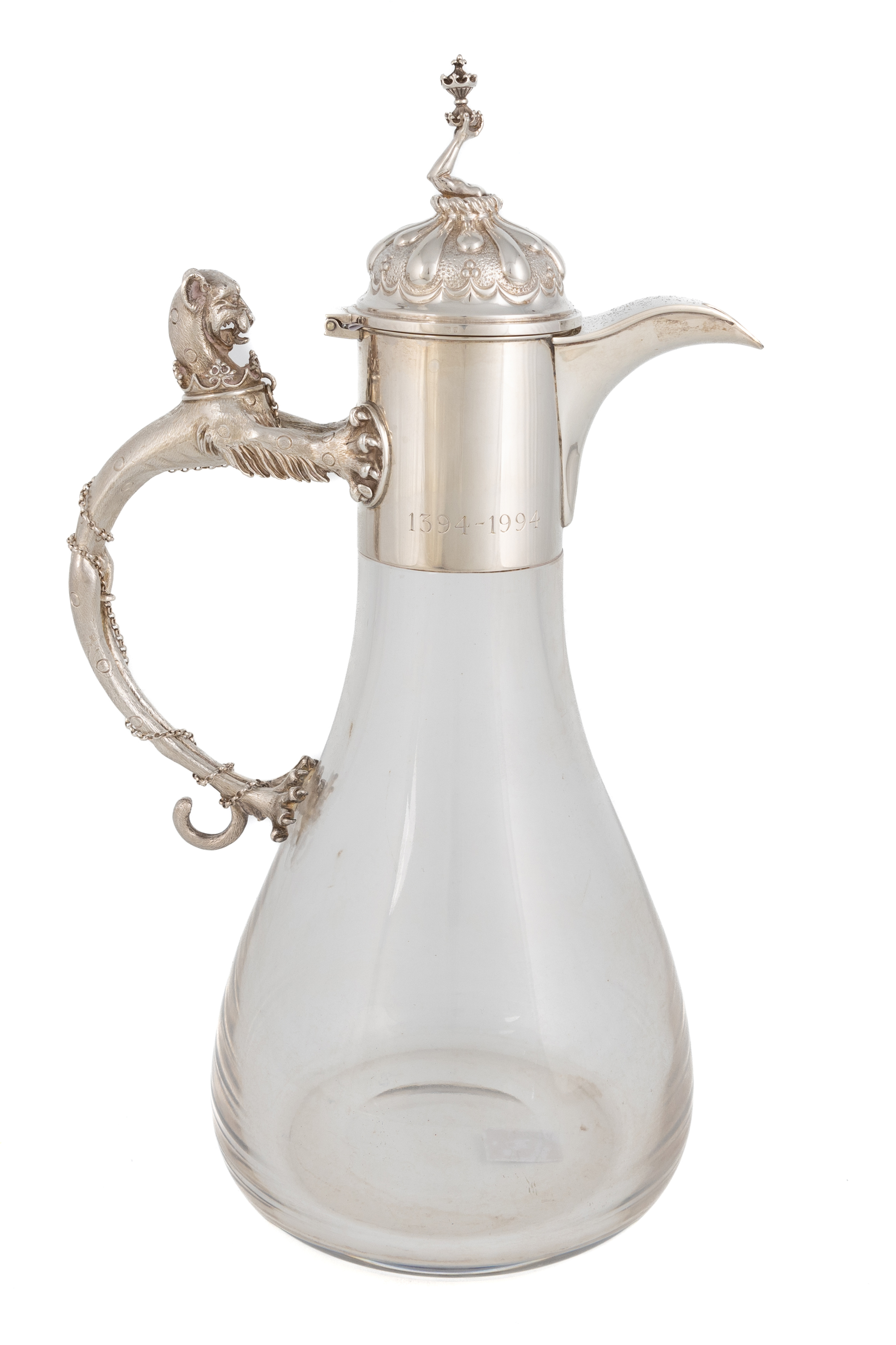 tapering bellied form, the handle in the form of a leopard with textured decoration, the domed hinged cover has fluted decoration and the Salters Company crest as its finial, height 31.2cm