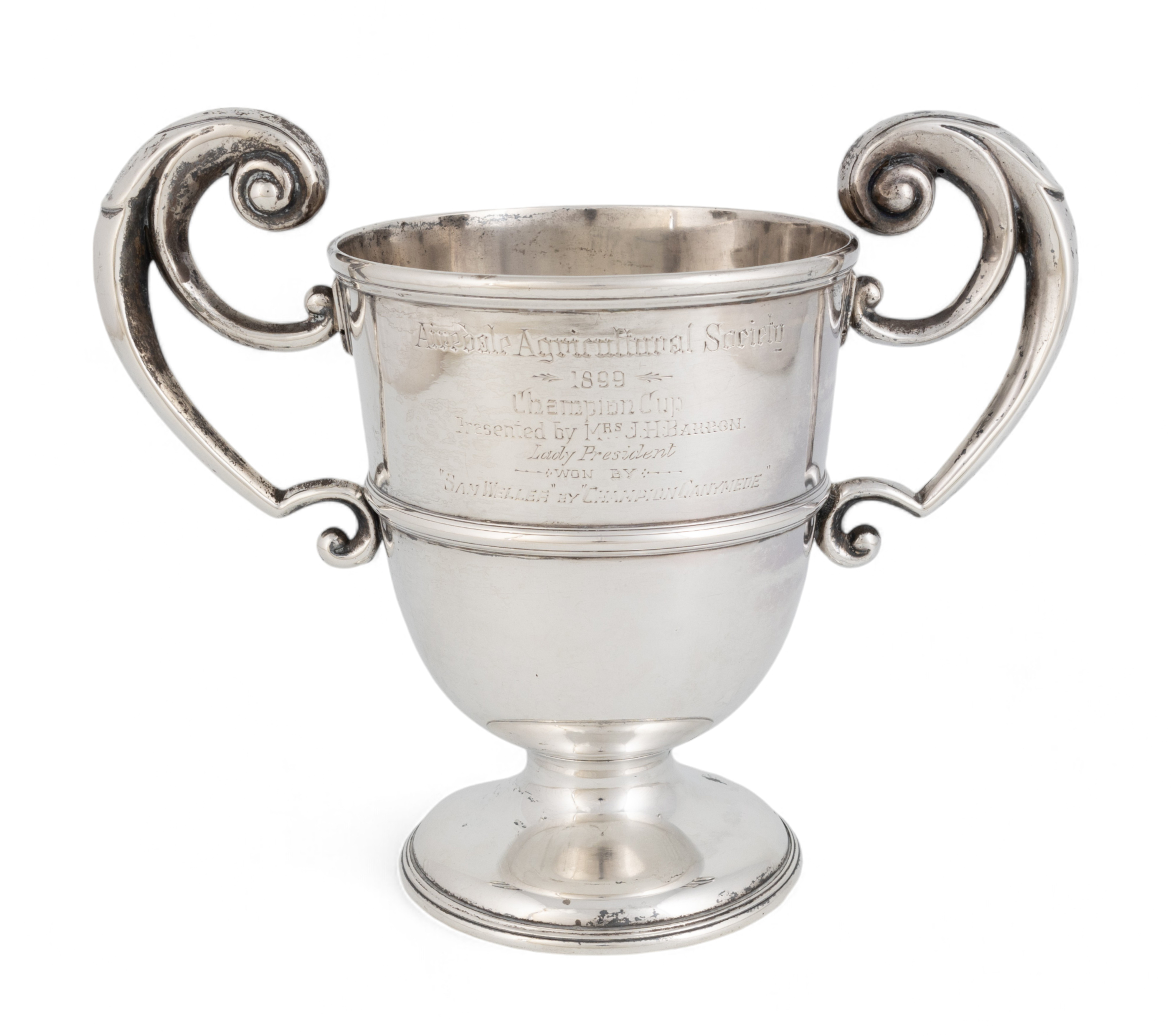 circular form, central girdle, scroll handles, with a presentation inscription from the Airedale Agricultural Society, height 20cm, approx. weight 21oz.