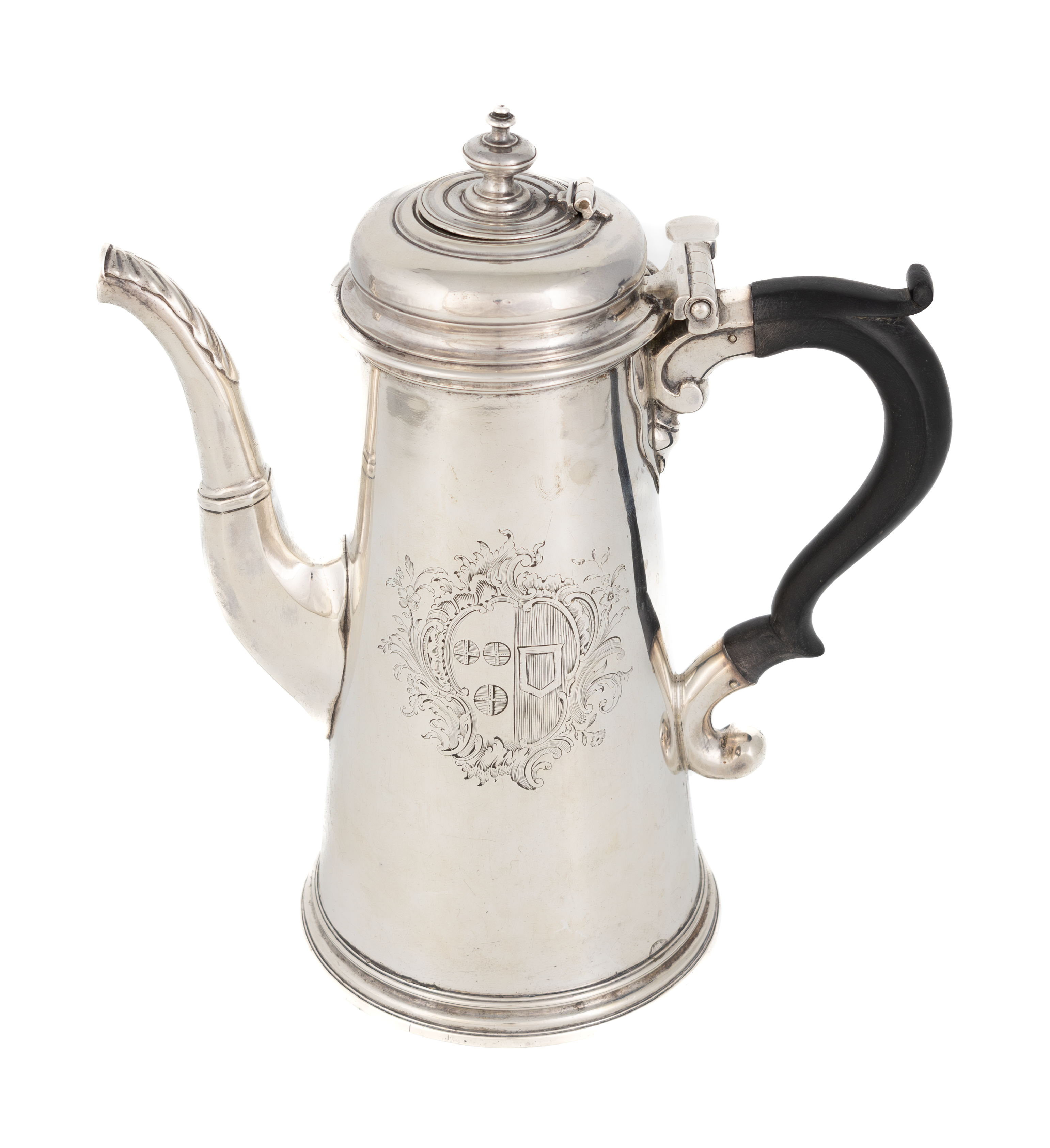 tapering circular form, leaf-capped spout, scroll handle, engraved with an armorial within foliate mantling, the hinged cover with a detachable hinge pin, and with an unmarked hinged finial, height 23.5cm, approx. weight 29oz.