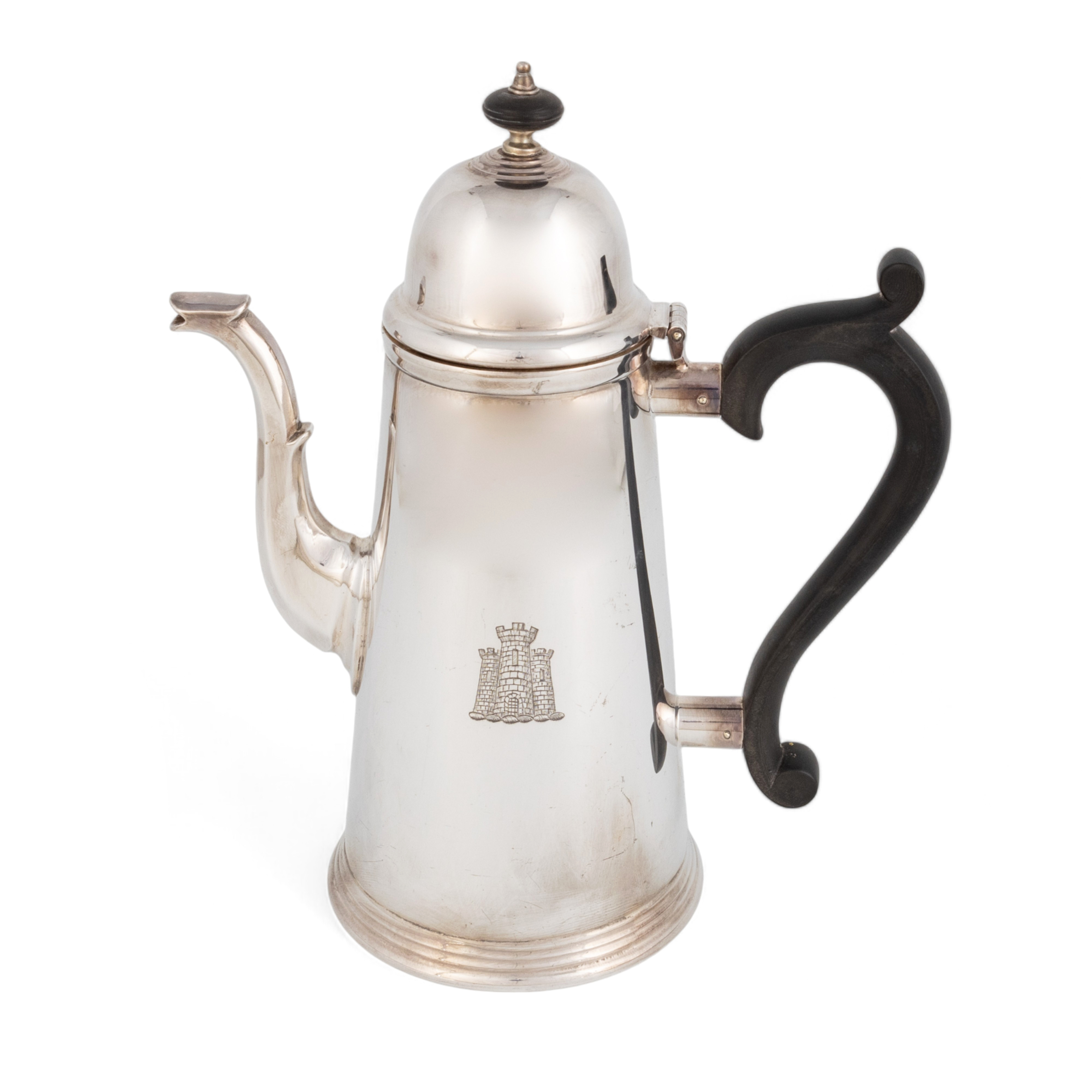 circular tapering form, domed hinged cover with a wooden knop finial, engraved with a crest, scroll wooden handle, faceted spout, height 25.2cm, approx. weight 23.8oz.