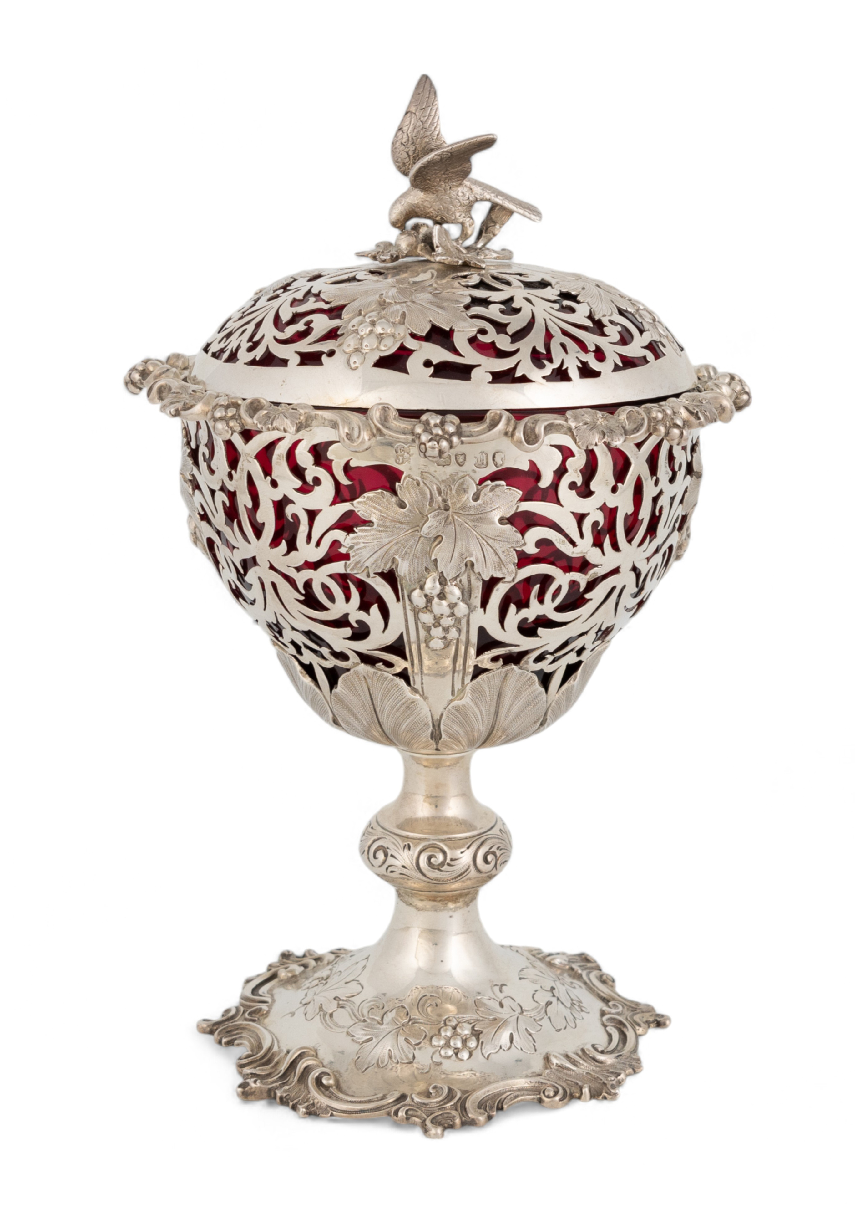 circular tapering form, pierced foliate scroll decoration and embossed with vine leaves and grapes, the pull-off cover with pierced decoration and with a bird finial, red glass liner, on a raised shaped circular foot, height 22.3cm, approx. weighable 10.4oz.