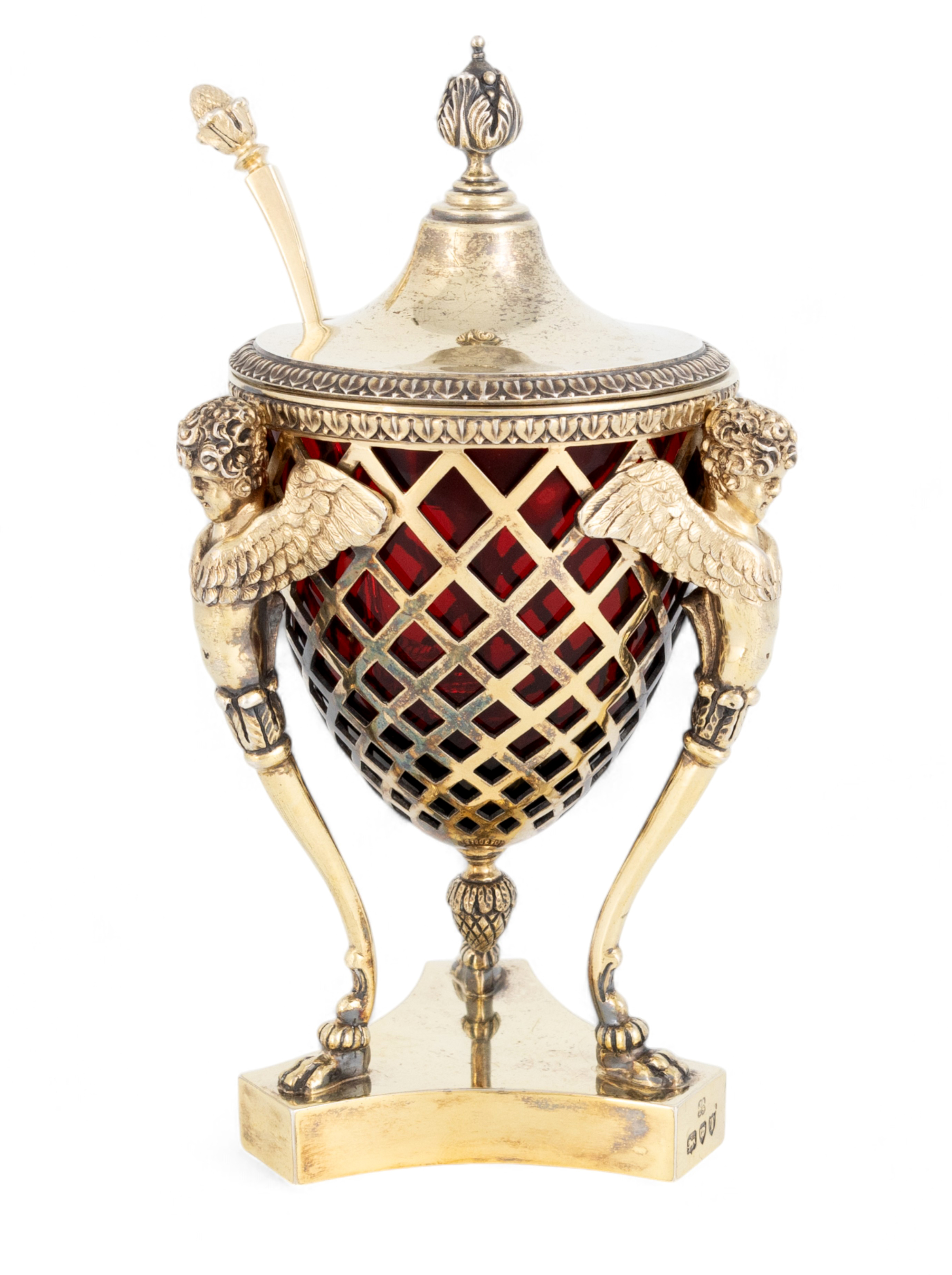 in the classical manner, vase form, pierced trellis decoration, on three winged cherub mounted scroll legs terminating in paw feet, on a shaped base, the pull-off cover with a foliate finial, with a red glass liner, the ladle with a shell bowl, height 18.5cm, approx. weight 18.2oz.