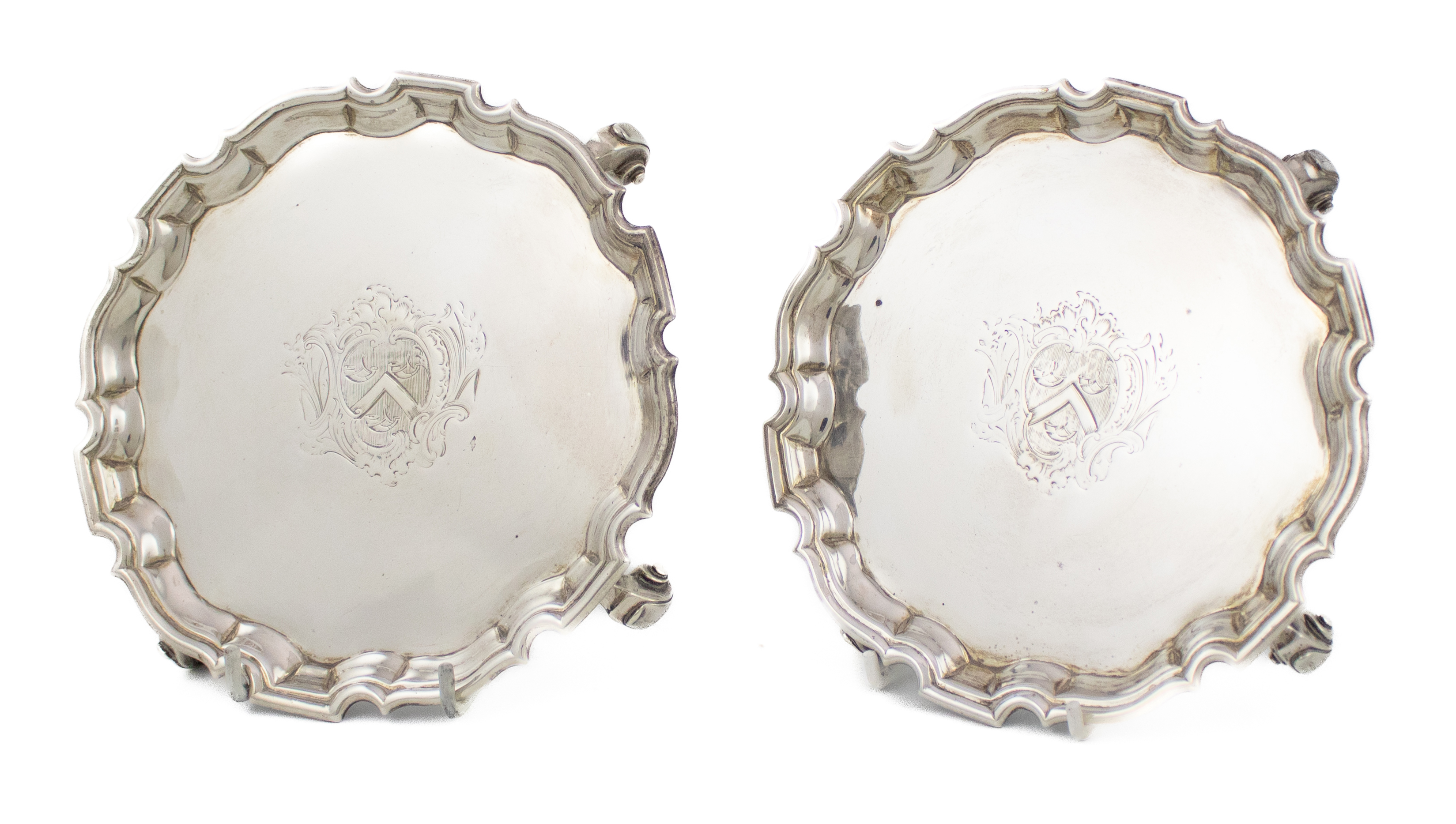 shaped circular form, moulded borders, central engraved armorials, on four scroll feet, diameter 16.7cm, total approx. weight 20.3oz. (2)