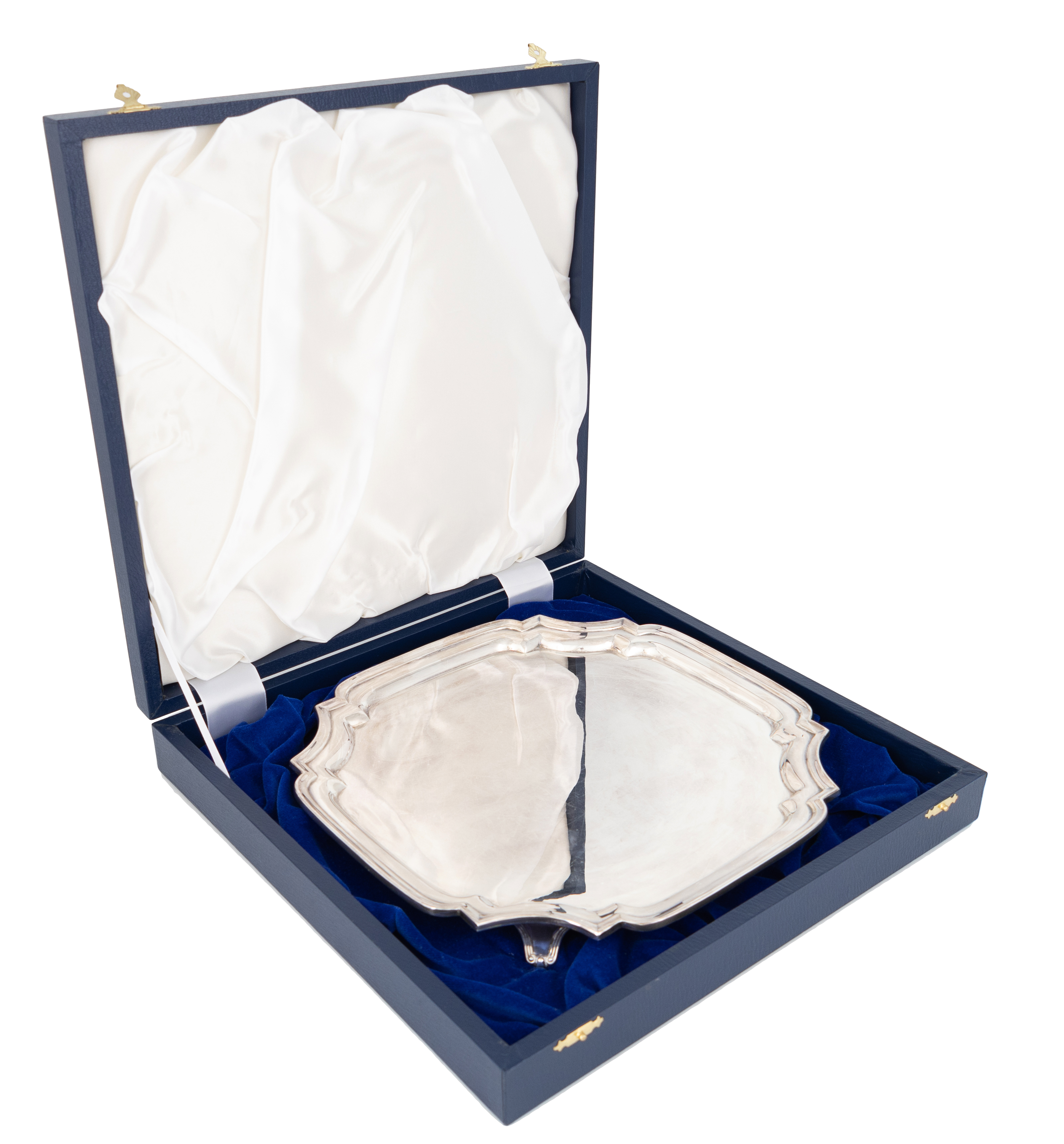 plain rectangular form, moulded border with canted corners, on four reeded border bracket feet, in a fitted case, length 26.6cm, approx. weight 24.7oz.