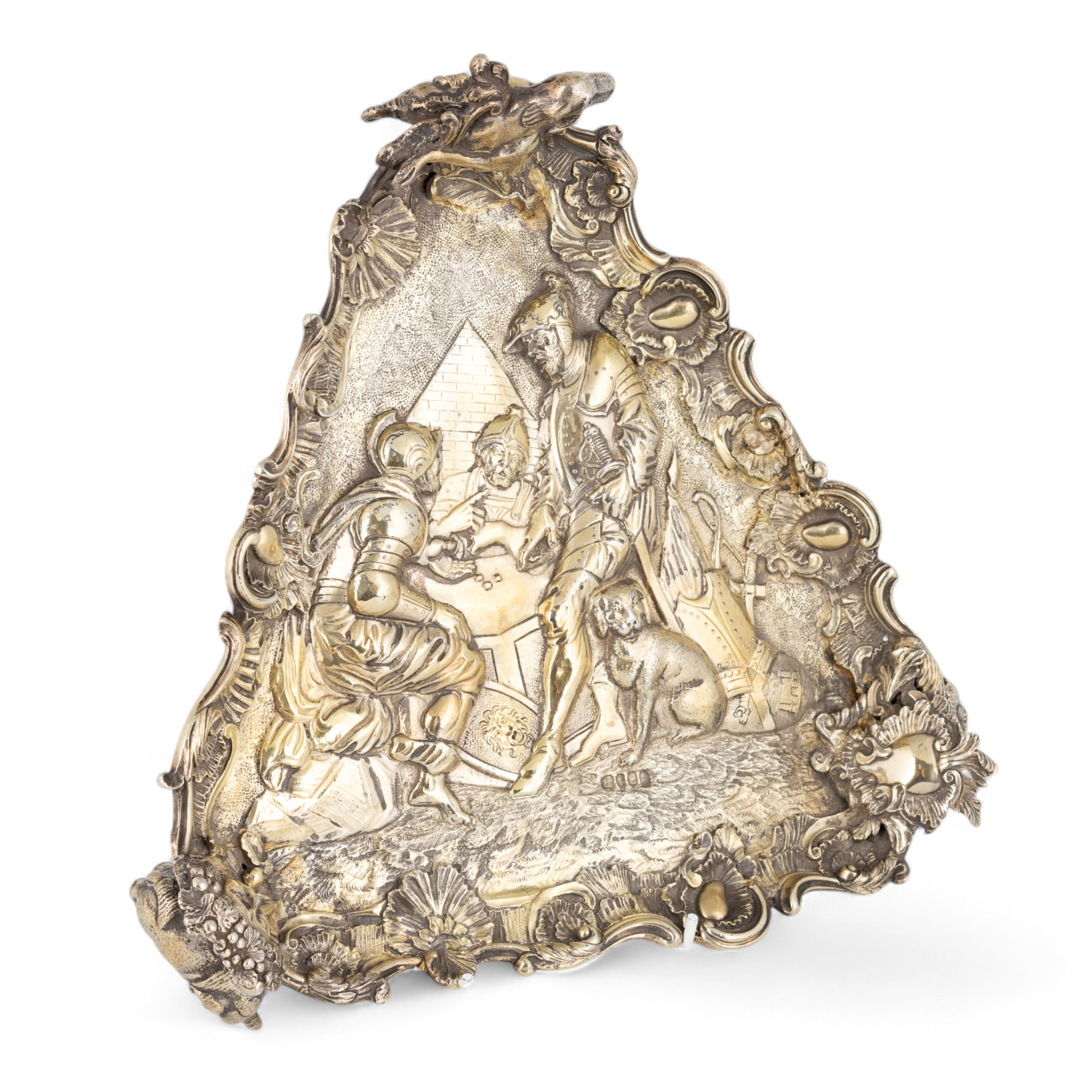 triangular form, the centre heavily embossed with three warriors playing dice, with a seated dig, shell and scroll borders the corners with a dog, a female mask and a vacant cartouche, on three elephant cast feet, length 26.5cm, approx. weight 35.7oz.
