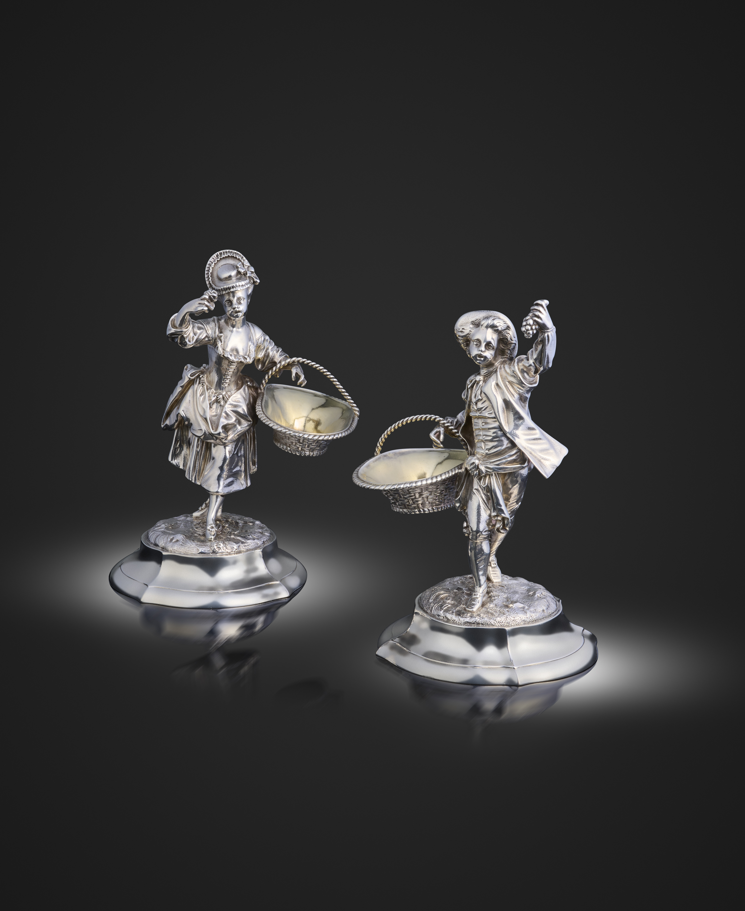 modelled as a gentleman and lady holding baskets, with gilded interiors, the gentleman also holding a bunch of grapes, the lady holding a flower, on raised shaped circular bases, height 17.2cm, approx. weight 33.4oz. (2)