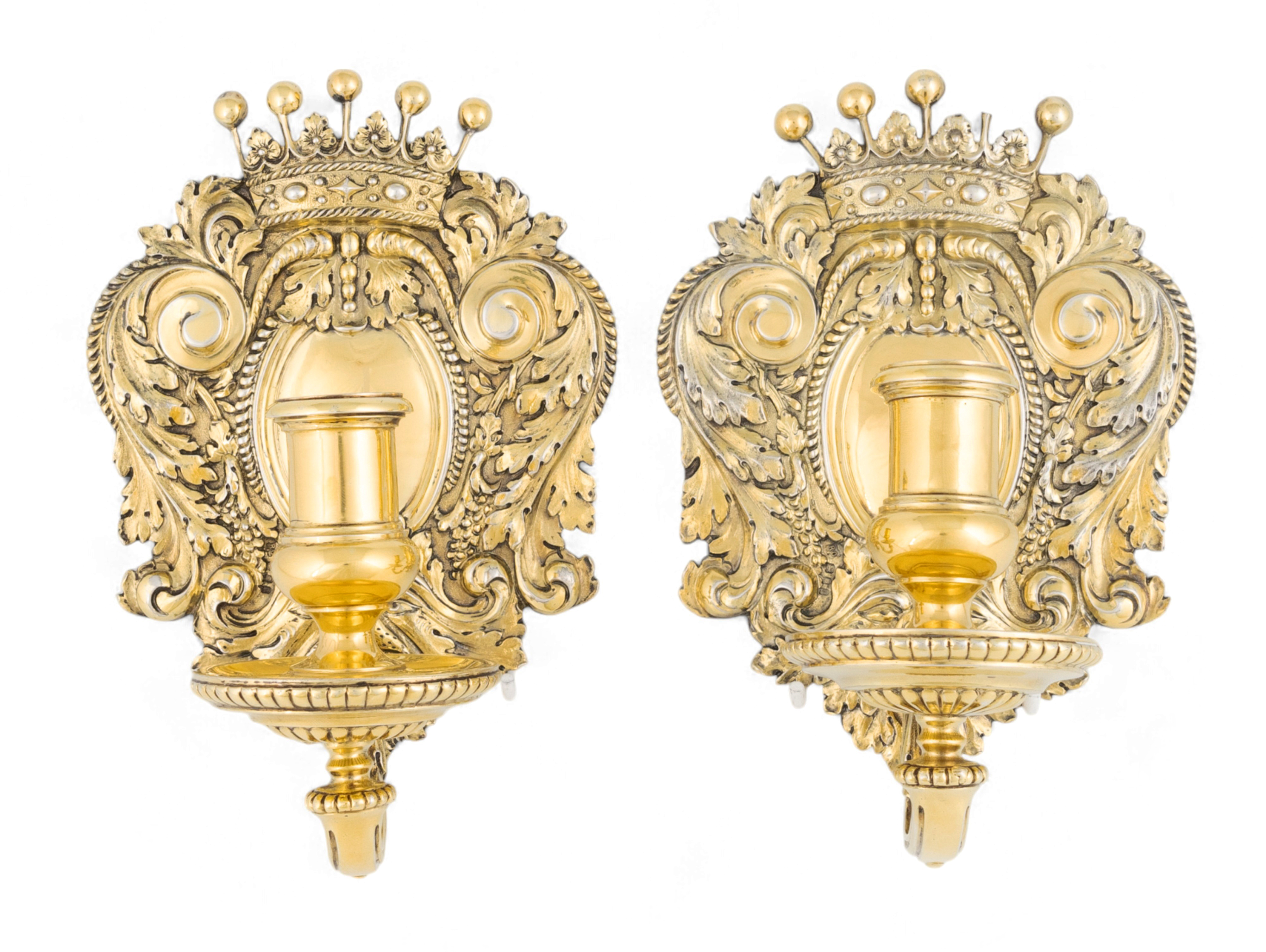 shaped oval form, with scroll foliate decoration with a central oval vacant cartouche, surmounted with a coronet, (one ball finial a.f), the leaf-capped scroll branch issuing from a mythical mask, spool-shaped capitals, with part fluted decoration to the drip pan, height 17.5cm, total approx. weight 23.3oz. (2)