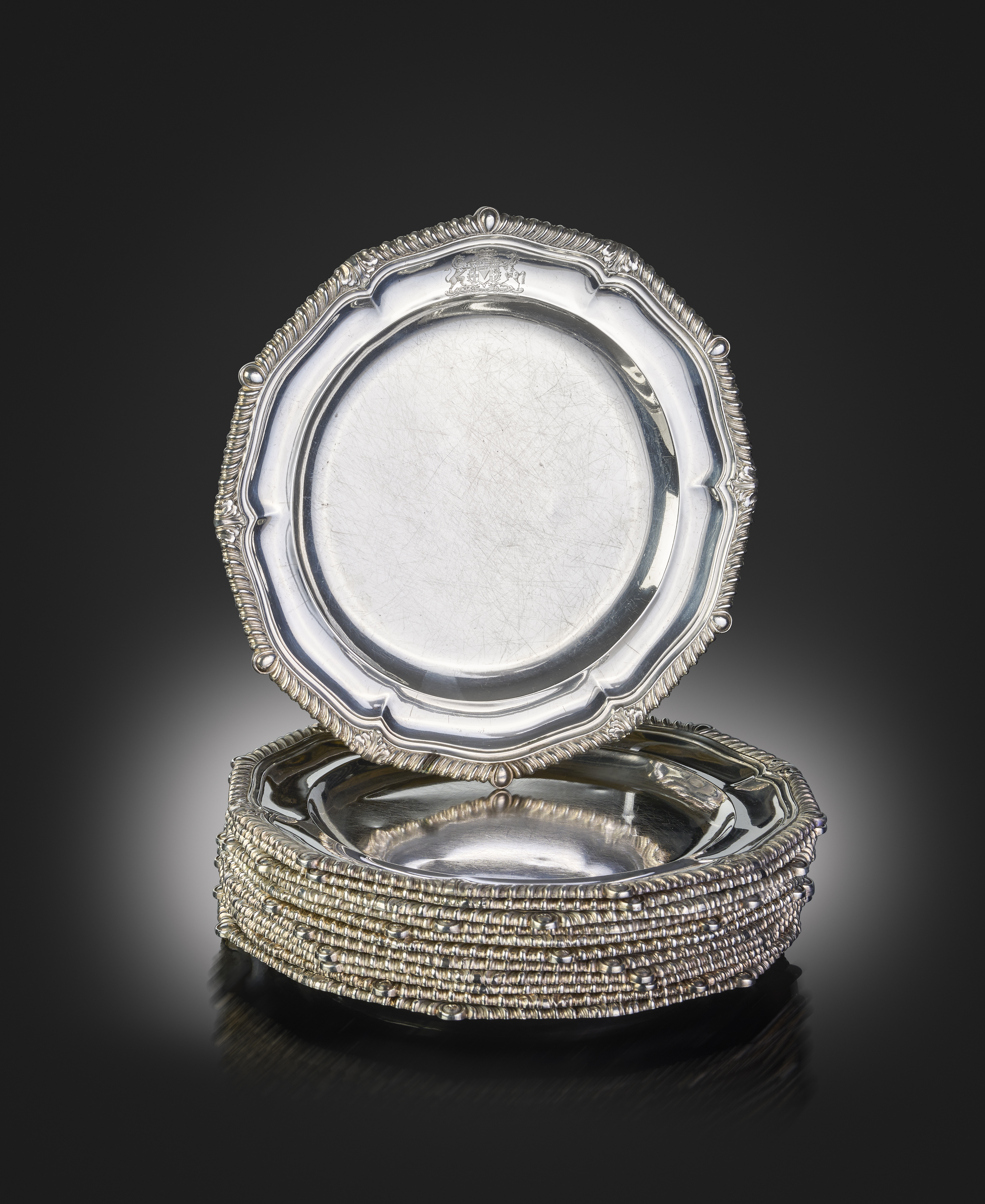 circular form, gadroon border, engraved with an armorial, diameter 25.8cm, approx. weight 255oz. (12)