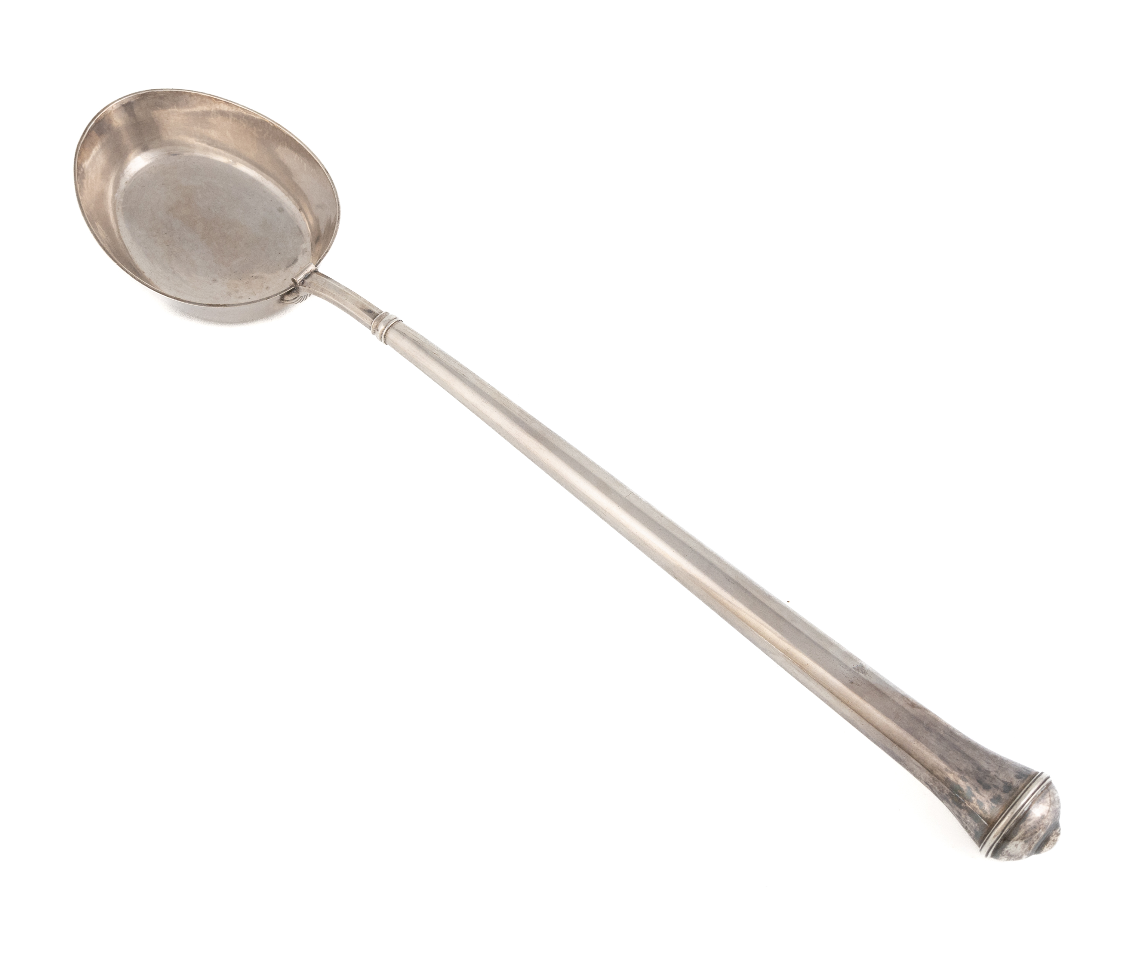 the oval bowl with a shell heel, the reverse scratch initialled 'H' over 'L.E', tapering handle, the bowl with a old collection label, length 39.5cm, approx. weight 5.6oz.