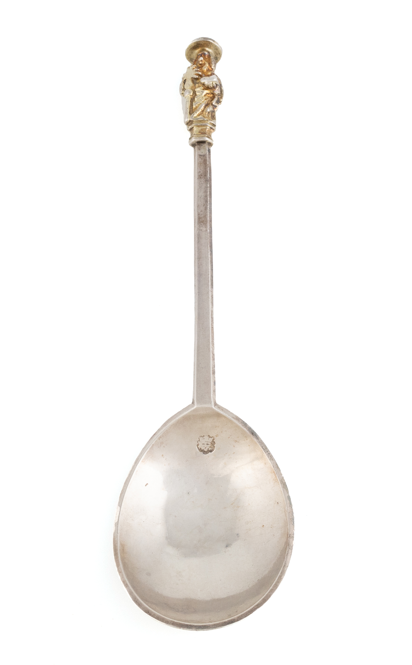 fig-shaped bowl, faceted tapering stem, gilded Apostle finial, with a holy dove nimbus, the reverse of the bowl prick-dot initialled '1641' over 'R.P' over 'T.R' with an old collection label, length 18.3cm, total approx. weight 1.8oz.