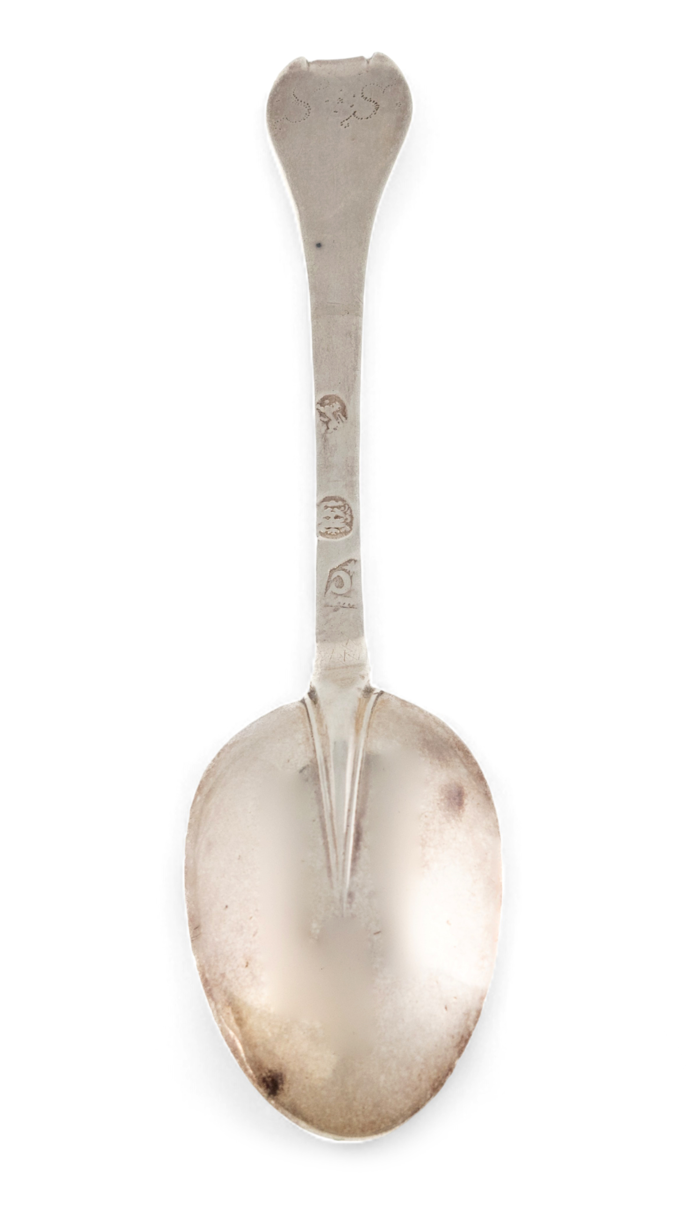 the reverse of the bowl with a plain rat-tail, the reverse of the terminal with prick-dot initials 'S.S', repaired, length 14.5cm, approx. weight 0.6oz.