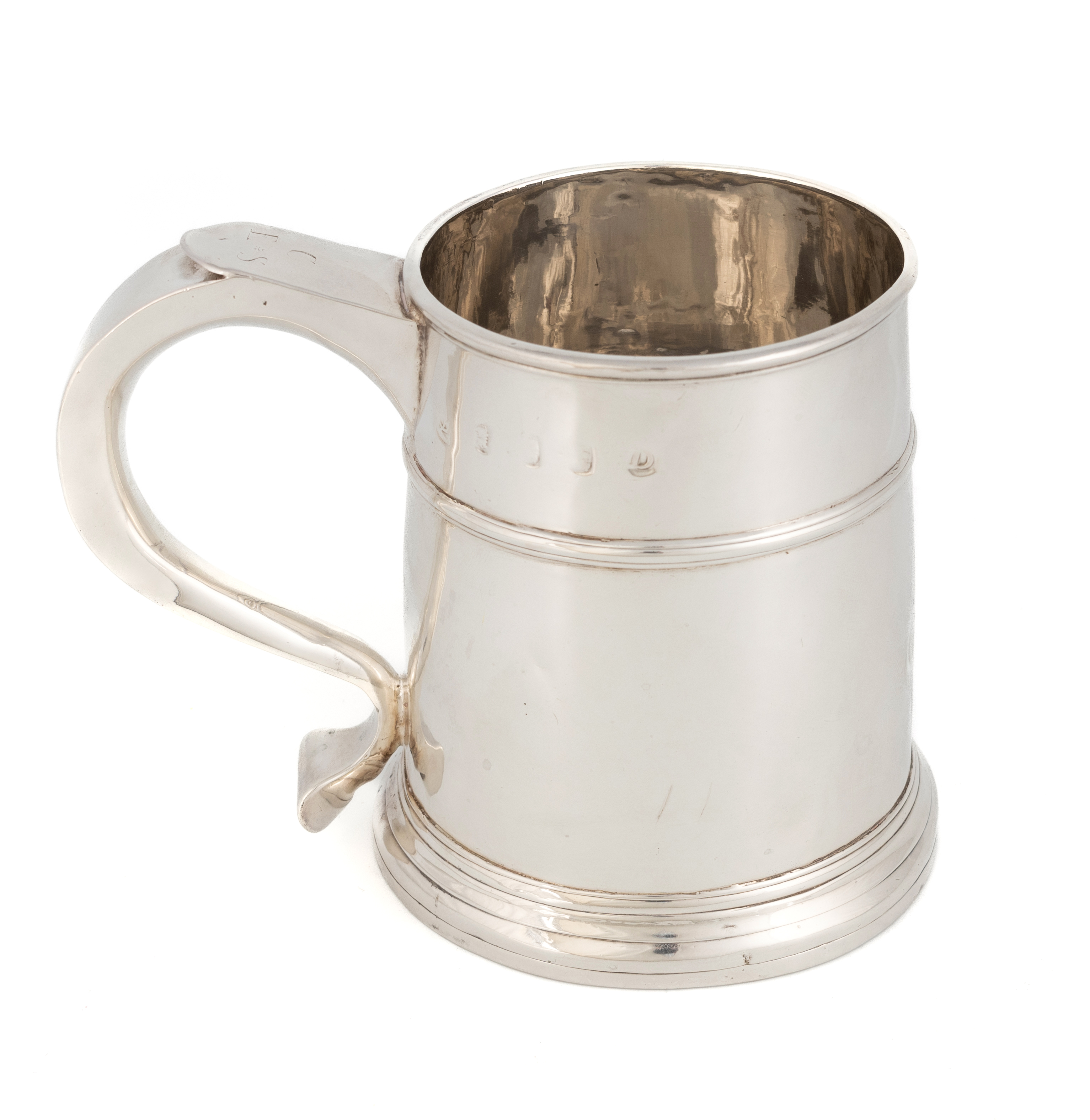 tapering circular form, scroll handle with scratched initials 'C' over 'E*S', reeded girdle, height 11.6cm, approx. weight 11oz.