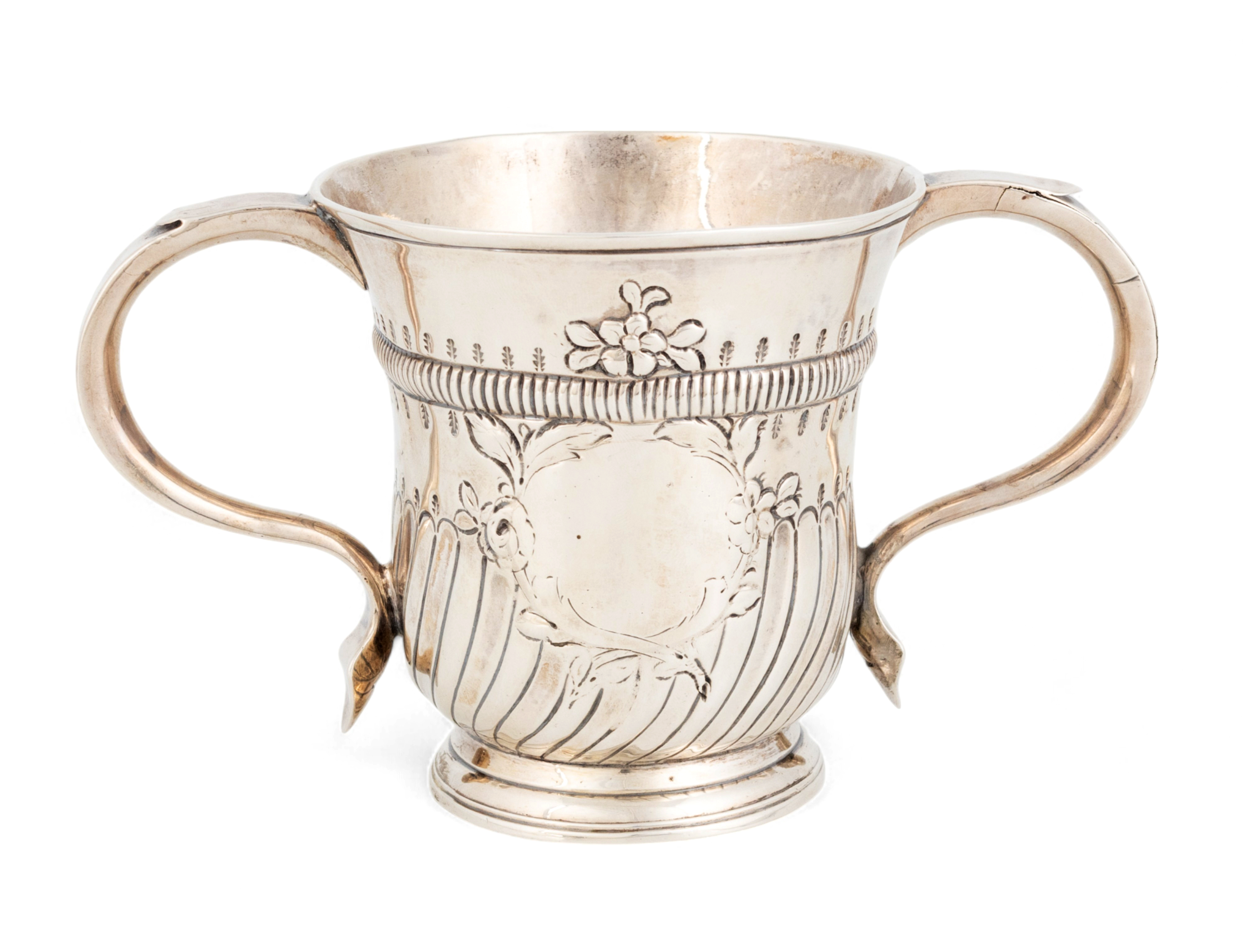 circular form with part-fluted decoration, scroll handle, rope-work girdle, with a vacant circular cartouche, length handle to handle 17.7cm, approx. weight 7.8oz.