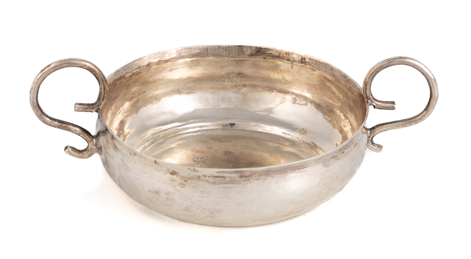 plain circular form, scroll handles, scratched initials to the underside 'MR', length 9.4cm, approx. weight 0.8oz.