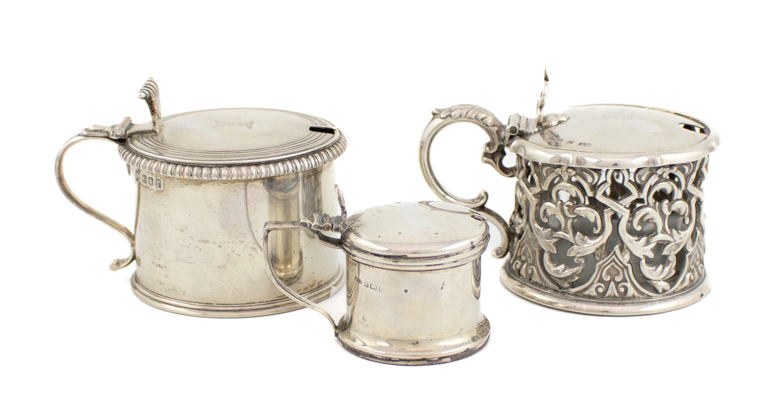 circular form, pierced chased scroll foliate decoration, hinged cover with a scroll thumbpiece and scroll handle, plus a small silver mustard pot by Docker & Burn Ltd, Birmingham 1926, and a silver mustard pot by Robert Frederick Fox, London 1912, diameter 7.6cm, total approx. weight 11.7oz. (3)