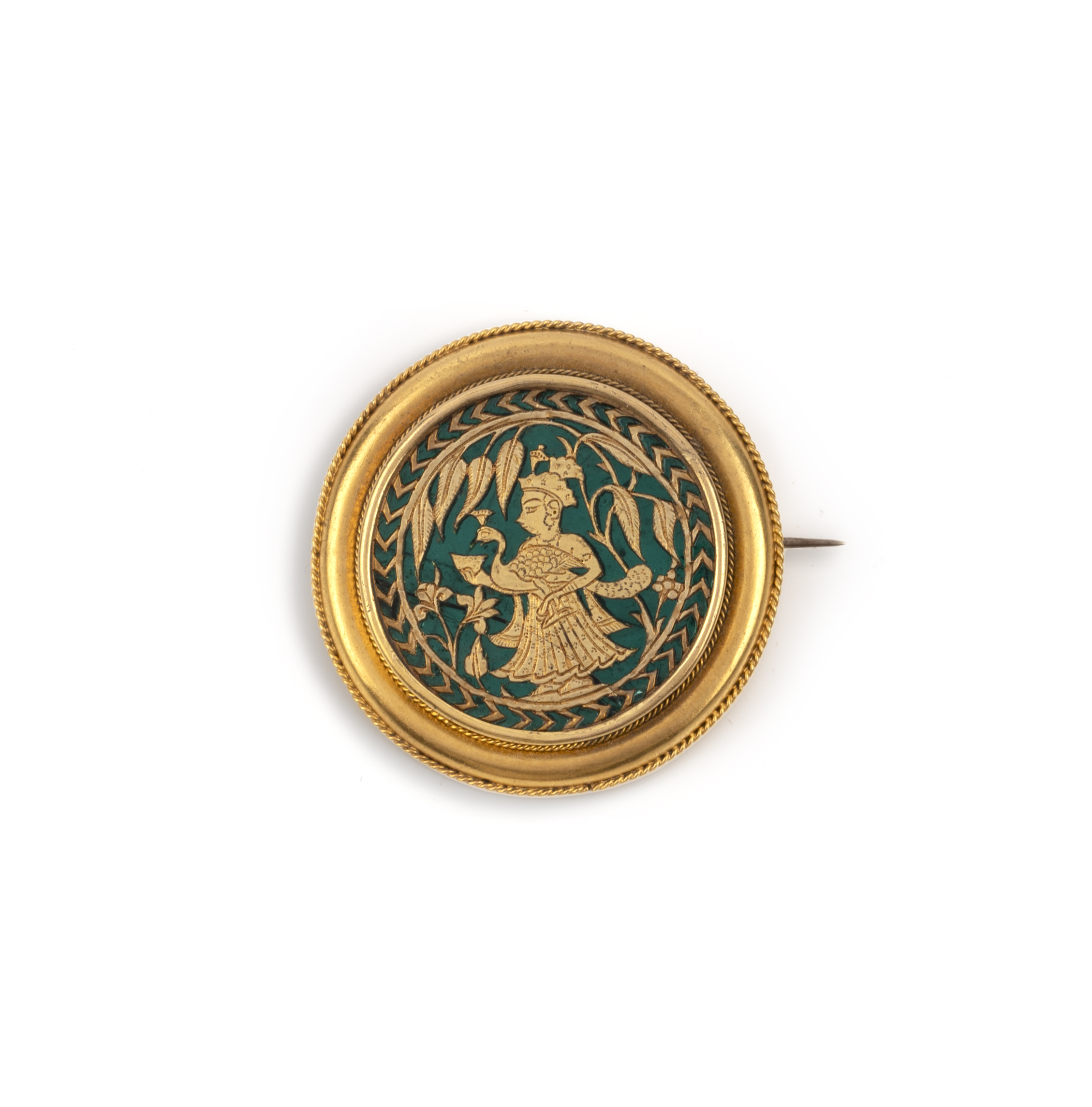 A gold and glass brooch, India and Western Europe, 19th century, of circular outline, set with a foiled green glass panel of Indian thewa work in cut gold leaf, depicting a figure among foliage holding a peacock and cup, within a gold brooch accented with rope twist borders, diameter 3.3cm