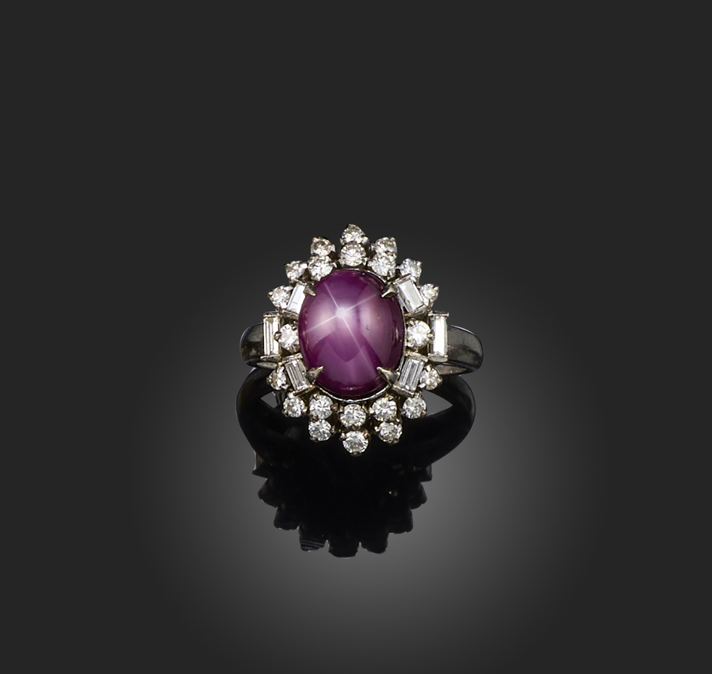 A star ruby and diamond ring, of cluster design, set with a cabochon star ruby, within a surround of