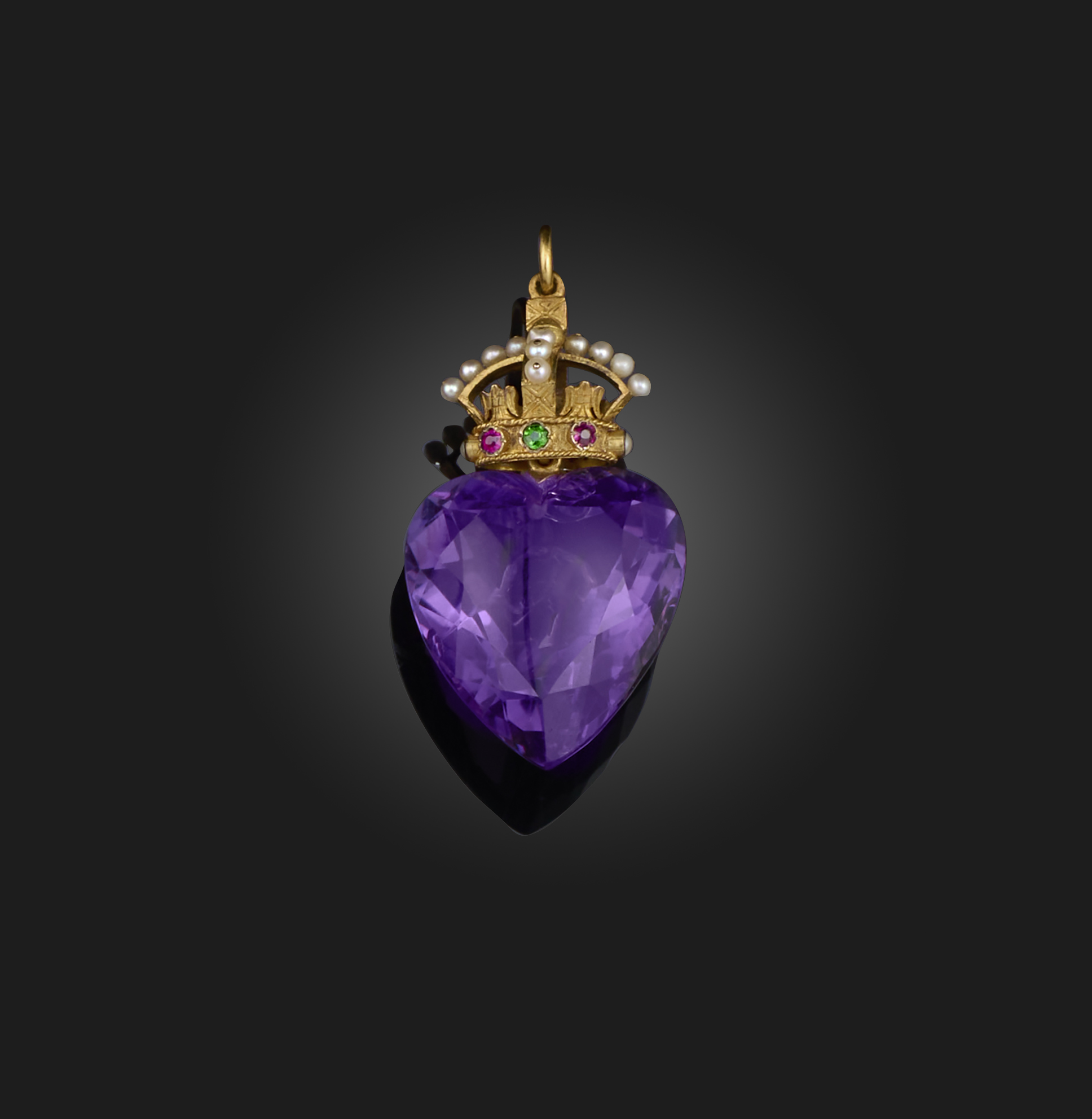 A Victorian amethyst and gem-set pendant, mid 19th century, designed as a heart-shaped amethyst surmounted by the Imperial State crown, set with circular-cut rubies, demantoid garnets and seed pearls, length 4.4cm