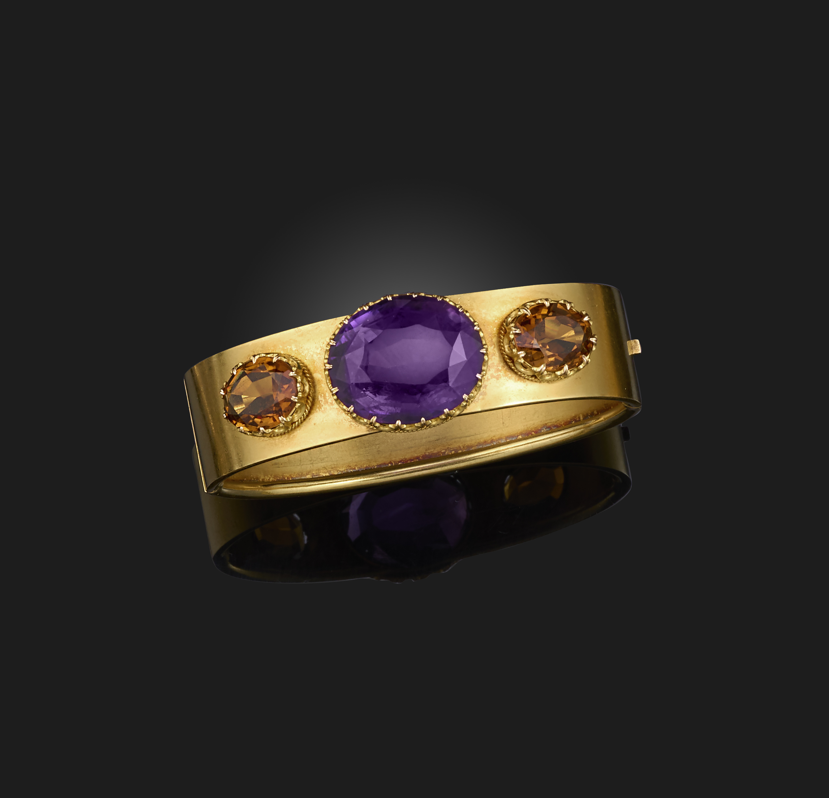 A Victorian amethyst and citrine bangle, set with a central oval-shaped amethyst, flanked with citrines in gold collets on hinged yellow gold bangle, inner circumference 16cm