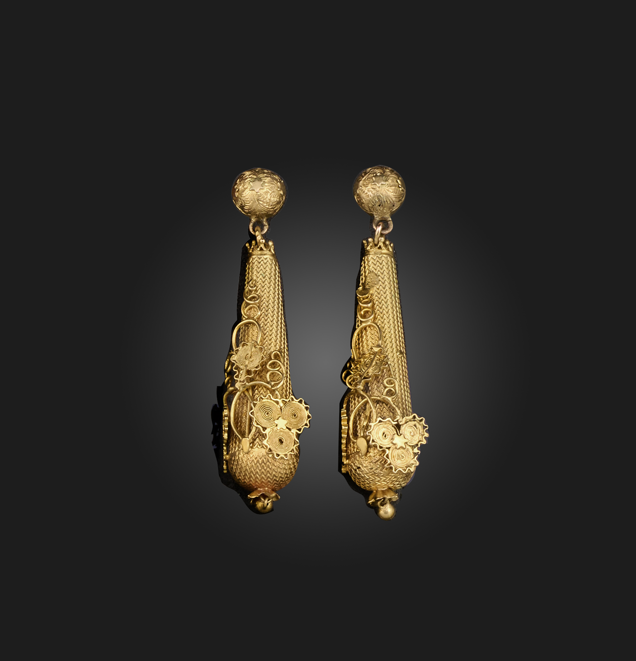 A pair of gold earrings, mid 19th century, each designed as an elongated gold drop with zig zag decoration, applied with stylised grapevine motifs in gold filigree, to a domed surmount, length 5cm each, later post fittings