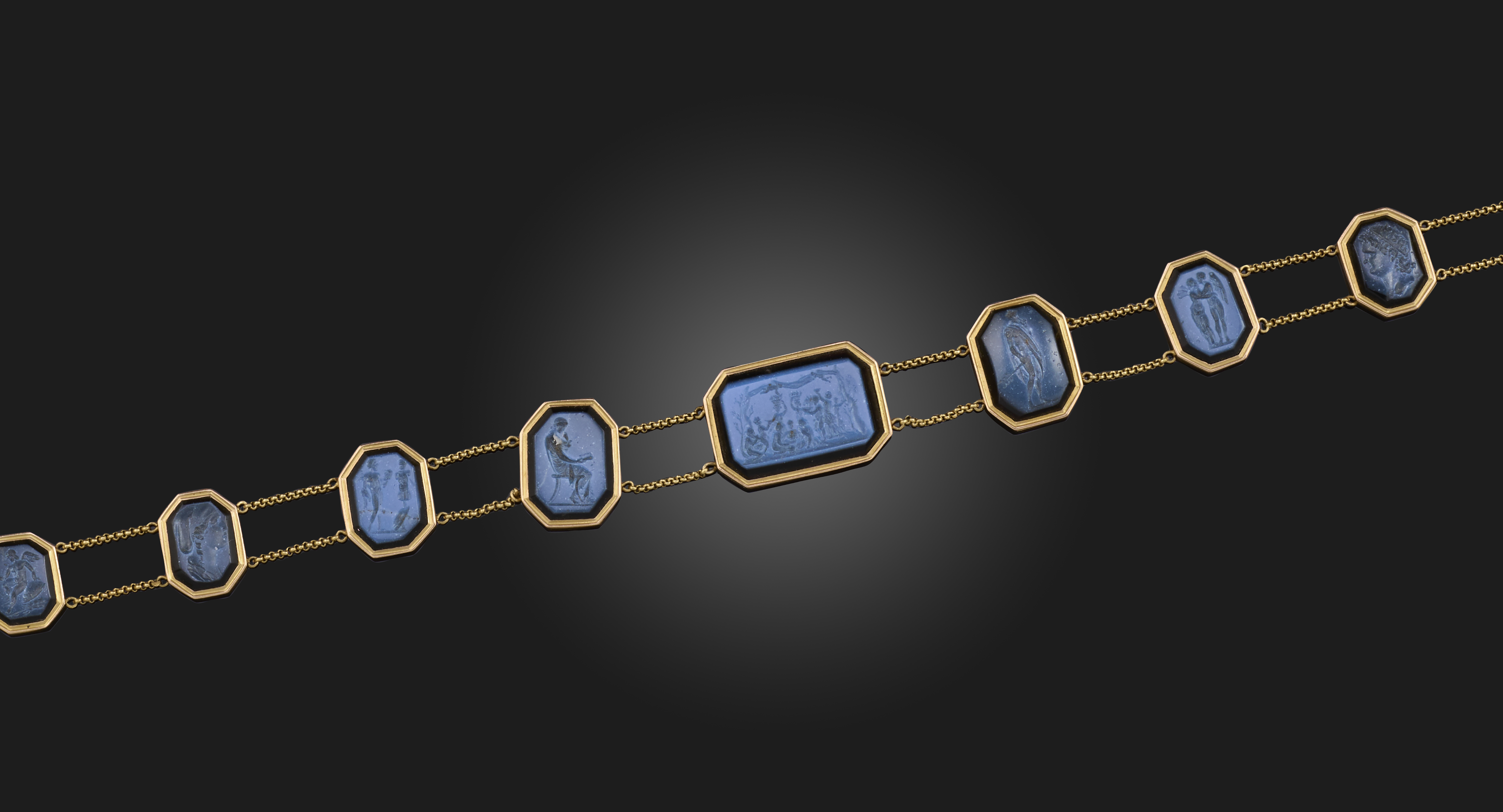 A glass intaglio necklace, early 19th century, composed of variously-shaped glass intaglios