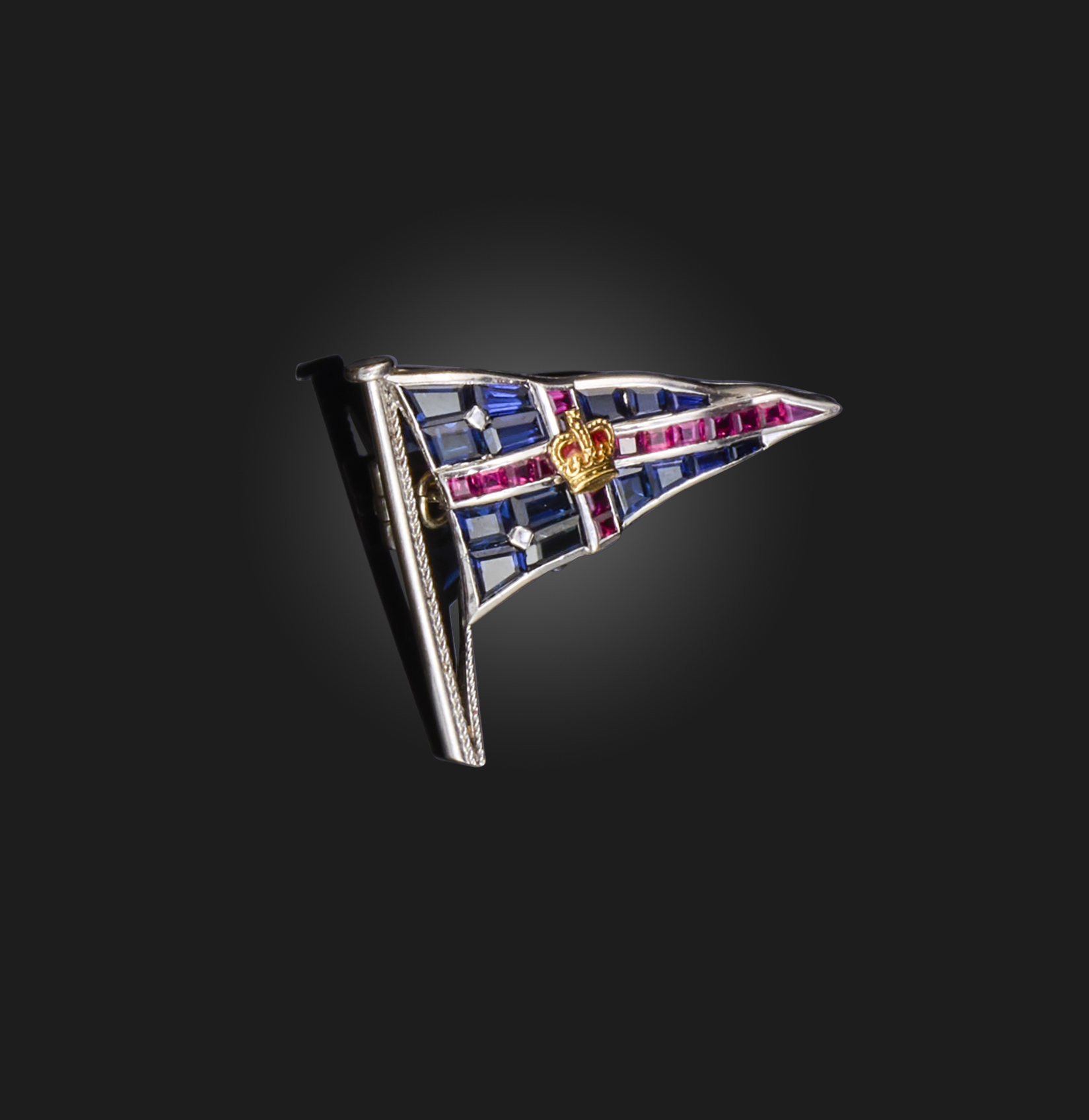 A sapphire, ruby and enamel brooch, designed as the burgee of the Royal Southern Yacht Club, set