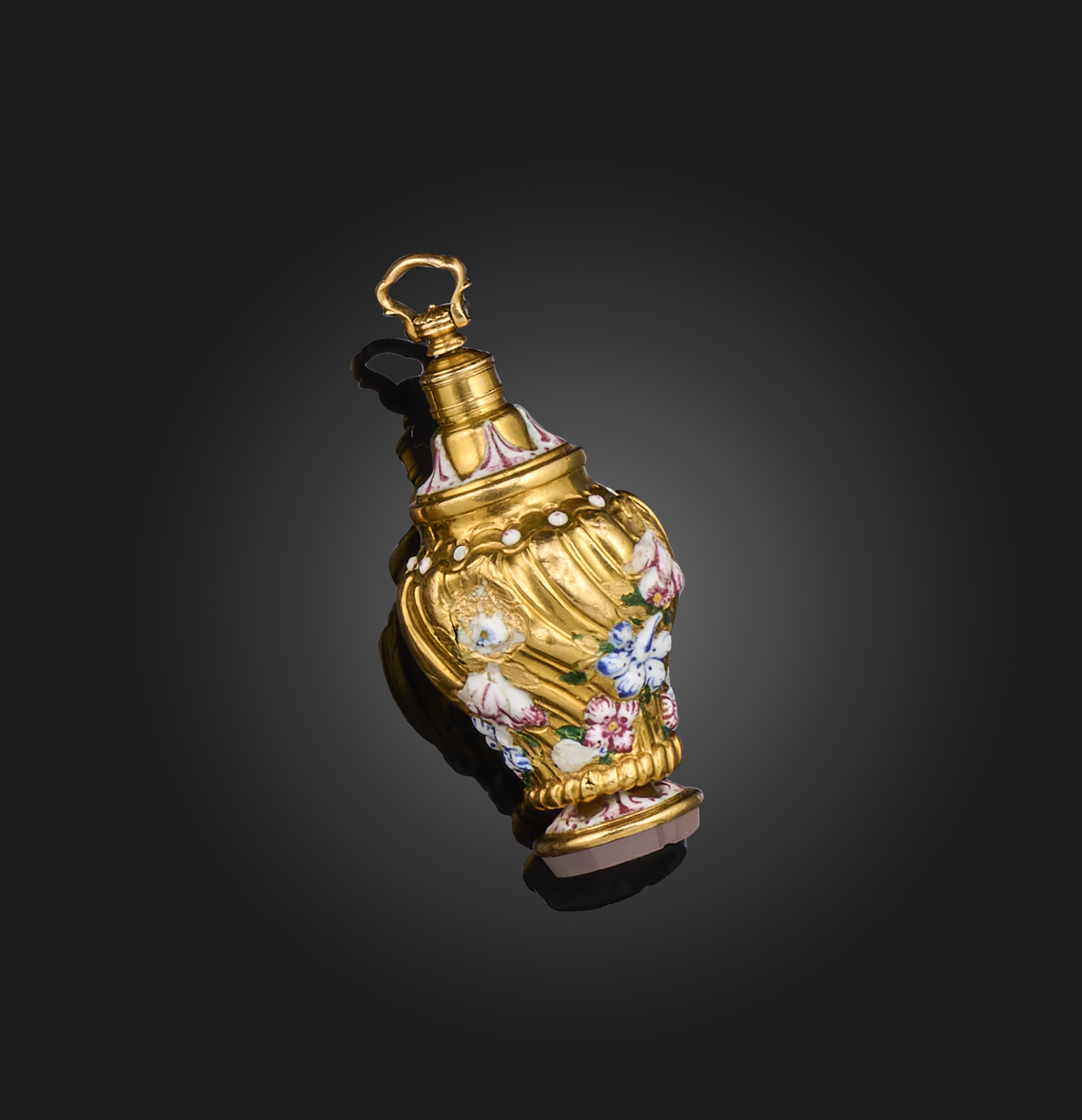 A rare Rococo gold, enamel and chalcedony scent bottle/fob seal pendant, mid 18th century, modelled as a baluster vase in gold chased with abstract scrollwork, applied with floral festoons and lappets in multicoloured enamels, to a screw lid with suspension hoop, the base with a white chalcedony intaglio depicting a bearded warrior in profile, possibly Achilles, height 4.4cm