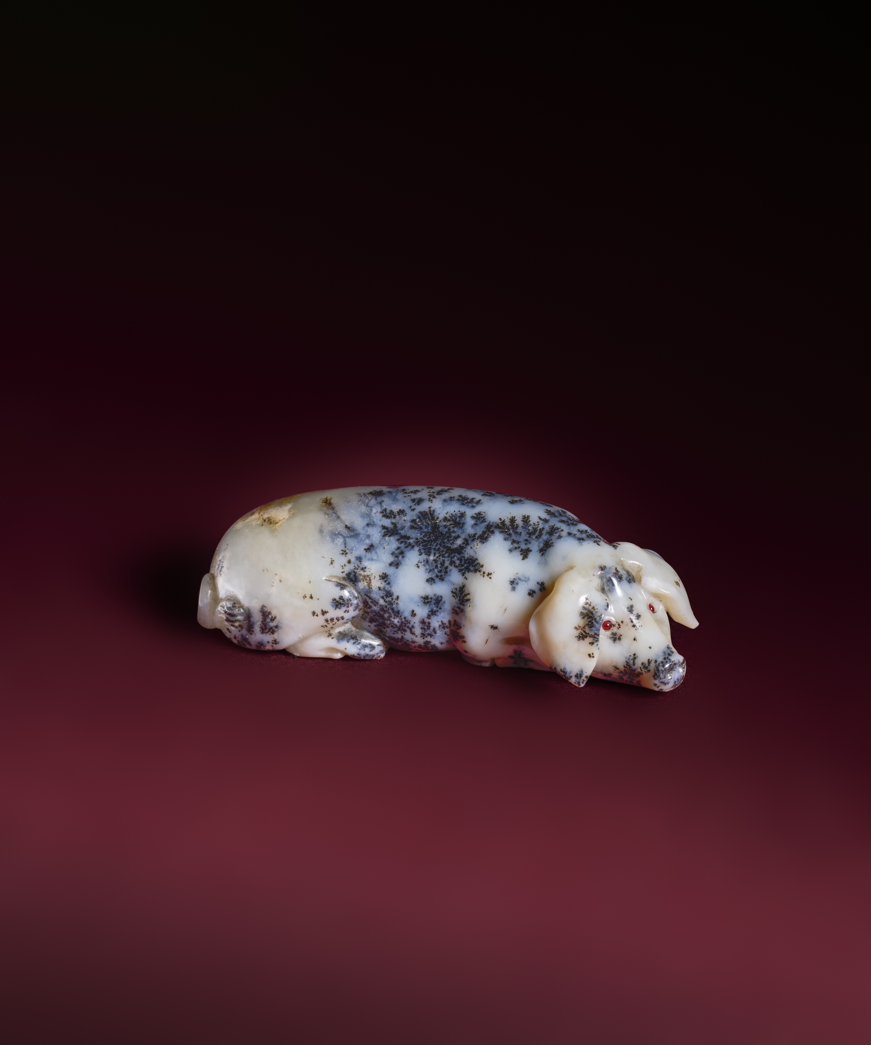 Fabergé, a dendritic agate miniature animal study, early 20th century, realistically modelled as a reclining Gloucester Old Spot pig, finely carved in dendritic agate, its eyes set with cabochons of red paste, measuring 8.0 x 3.0 x 2.1cm, eyes later replacementsThe quality of this carving and the sensitive treatment of its subject compare favourably with a number of hardstone animal studies produced by the workshops of the Russian imperial jeweller Fabergé. Animal carvings are among the jeweller's most celebrated creations, adored and collected by some of the most prominent figures of the early 20th century. Russia's stone carving industry centred on the city of Yekaterinburg, where Fabergé acquired the workshop of lapidary Karl Woerffels around 1884, and it was this workshop that produced the majority of them - the carvers Kremlev, Derbyshev and Svetchnikov, managed by the German Alexander Meier. The stones were carefully selected by Carl Fabergé's son Agathon, and were mostly of Russian origin, taking advantage of the rich mineral resources of the Ural mountains and Siberia. The animal carvings found immense popularity with a number of the firm's key patrons, most notably the British Royal Family, whose collection boasts more than 350 animals, and Léopold de Rothschild, who had his racehorses similarly immortalised by Fabergé's sculptors.The dendritic or 'moss' agate used here is an unusual choice for an animal study, its distinctive patterning more commonly employed by Fabergé for inlays and panels in its jewels and objets de vertu. Traditionally found in India but eventually sourced by Fabergé from Siberia, its use here is likely a clever attempt to mimic the distinct patternings of a particular breed of pig known as the Gloucester Old Spot, whose 'lop' ears are also distinctively forward folding as in the present carving, partially shielding its eyes. A number of realistically modelled farm animals including pigs were produced from life at the Sandringham estate in 1907, following a suggestion made to King Edward VII by Fabergé's London agent Henry Bainbridge that the firm recreate a number of the animals across the estate. With subjects ranging from the King's own terrier dog Caesar, to the cows, pigs, ducks and chickens that populated the farmland around them, the animals of this 'Sandringham Commission' were reproduced in wax sculptures by the carver Boris Frödman-Cluzel, before being sent back to the Russian workshops to be immortalised in hardstone. They were then sent back to Fabergé's London branch for purchase, mostly, but not exclusively, by those who wished to gift them back to the Royal Family. Such was the appeal that some were even acquired by members of the family themselves, such as Princess Victoria, who bought a model of a recumbent white sow in pale pink aventurine quartz in 1912 (RCIN 40041). It is not known whether the present study would have been part of the Sandringham commission, but the close attention to detail and the choice of this lesser known breed of pig reflect a close observation of the animal, likely in its agricultural setting, and a desire by the sculptor to capture the distinctive characteristics of this specific breed. King Edward VII was particularly proud of his pigs and sent the best of his herd to The Royal Society Show in June 1911. Pigs were one of Fabergé's more popular animal studies in their native Russia, with several examples recorded in the collection of Empress Maria Feodorovna, and are also among the most humorous and varied of their miniature sculptures.Cf.: a series of carved hardstone pigs by Fabergé in the Royal Collection, collection nos. RCIN 40041, 40038, 40421 and 40422, commissioned by the Royal Family and studied by Fabergé's sculptor Boris Frödman-Cluzel from life at the Sandringham estate in 1907.Cf.: The Robert Strauss Collection of Works of Art by Fabergé, Christie's, 9th March 1976, lot 28, and A. Kenneth Snowman, The Art of Carl Fabergé, 1972, no.237, for