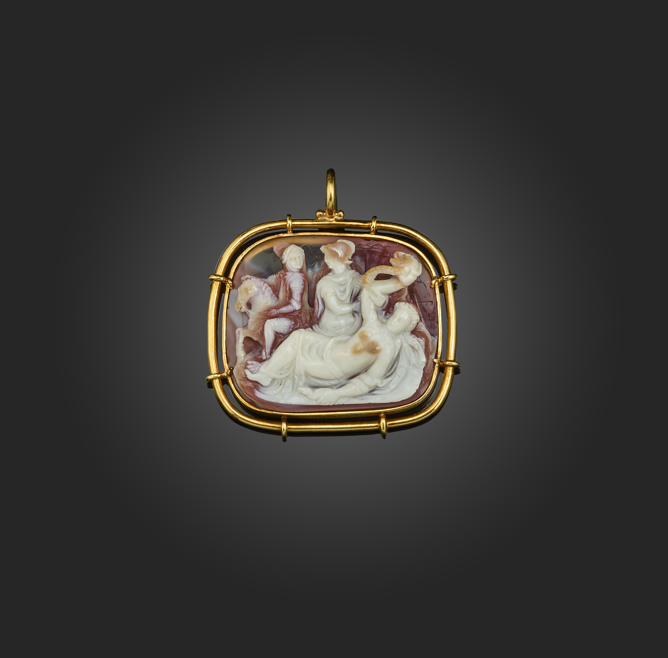 A hardstone cameo pendant, 17th century and later, the carved agate depicting Mark Antony and Cleopatra being given the kiss of death by an asp, within a later gold frame, width 4.5cm, fitted case