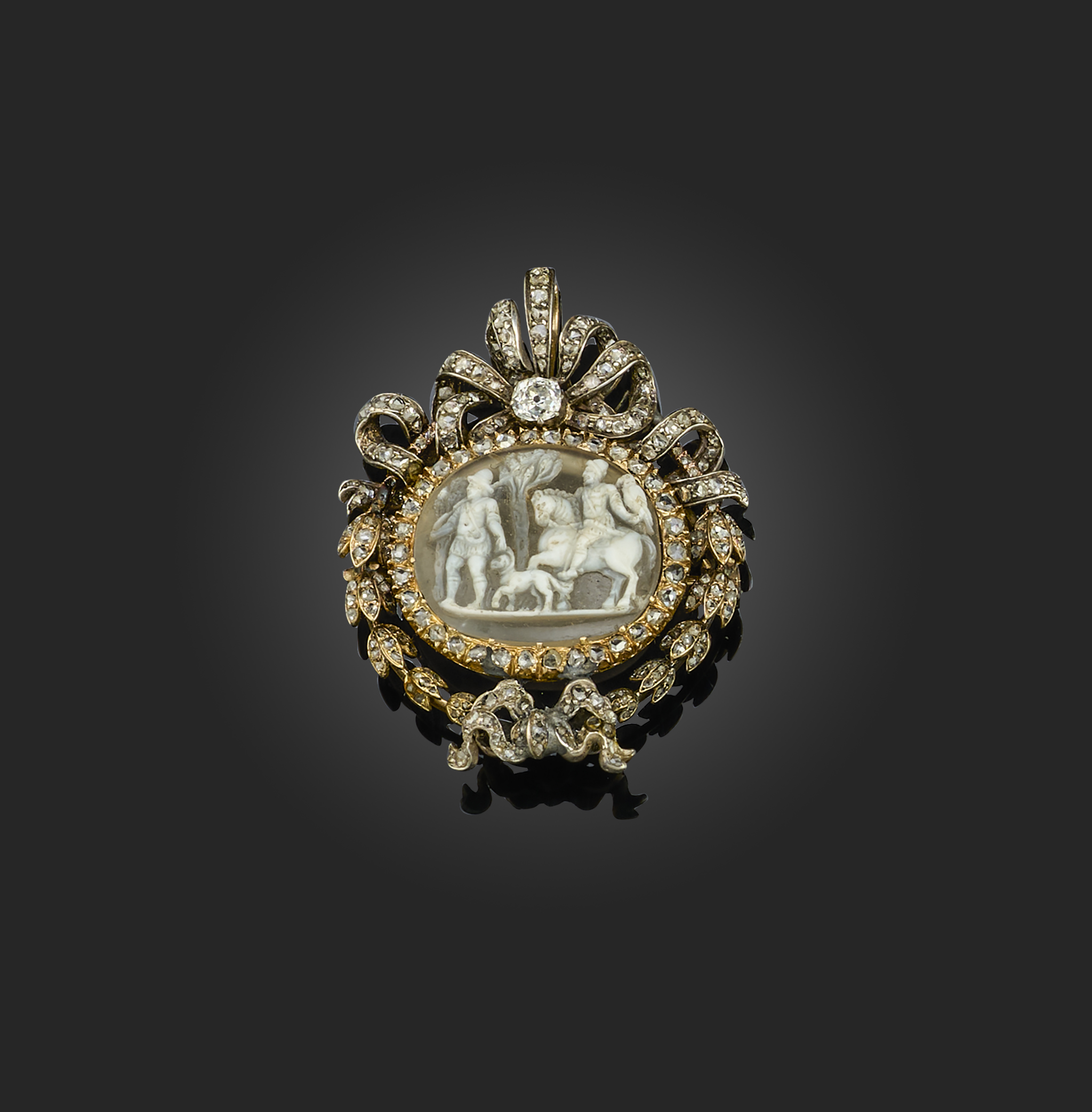 An agate cameo and diamond brooch, Germany, circa 1550, mount circa 1900, set with an agate cameo carved to depict a hunting scene, within a later brooch of ribbon bows and foliate festoons set with rose-cut diamonds and centring on a cushion-shaped diamond, the reverse of the cameo with a glazed compartment, mounted in silver and gold, length 4.3cm, cameo 1.6 x 1.9cm, case