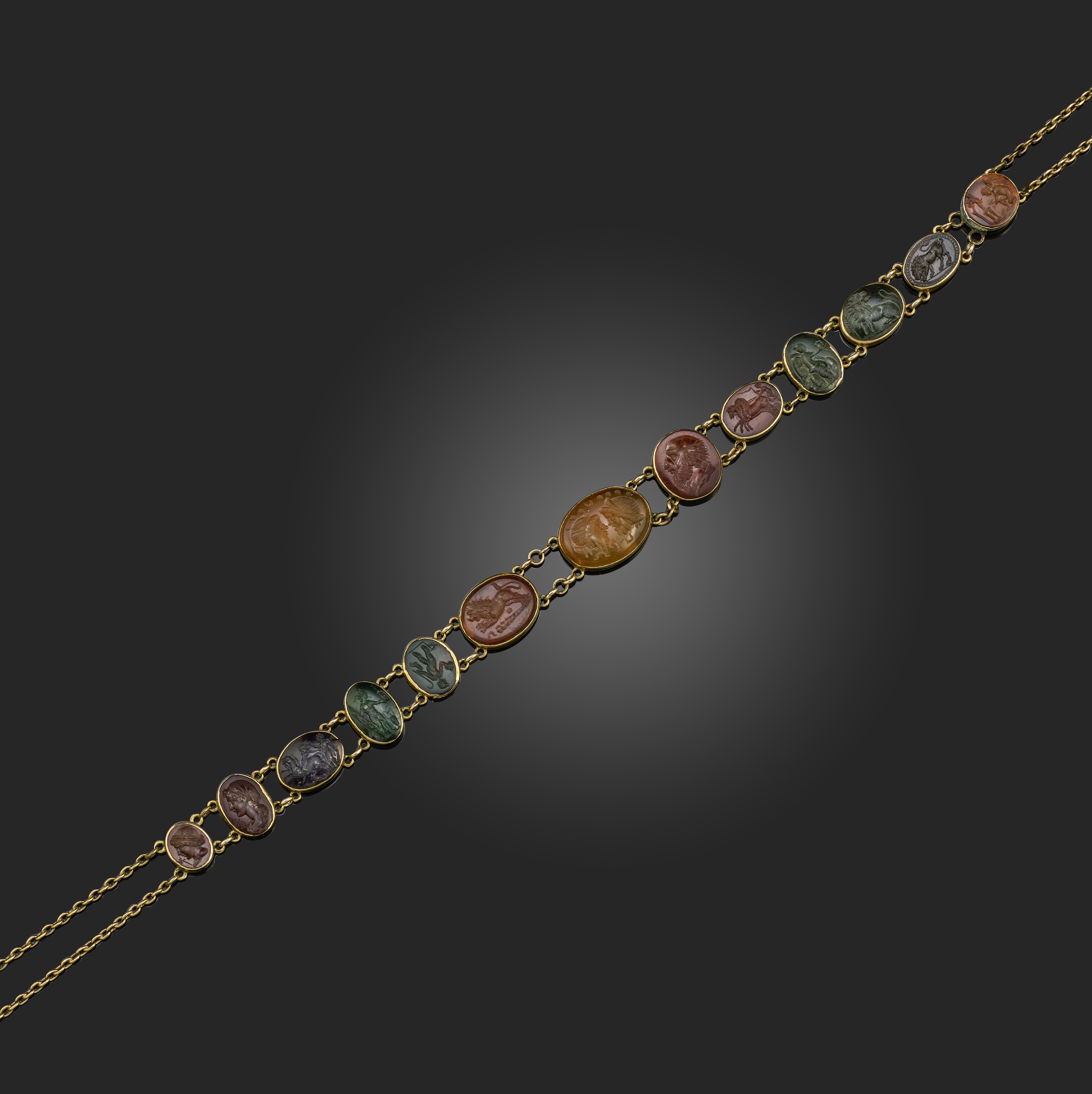 A hardstone intaglio necklace, intaglios Roman, 1st-3rd century AD and later, set with a sequence of thirteen ancient Roman and 18th century intaglios, each in a gold collet setting, to a double back chain, the intaglios including: Hermes in profile and lady in profile, carnelian, both 18th century; Hercules tearing a youth from horseback, amethyst, 18th century; a nude warrior bearing arms, possibly Achilles, chrome chalcedony, 1st-3rd century AD; a young satyr with hunting stick (pedum), bloodstone, Roman, 1st-2nd century AD; the Nemean lion, carnelian, 1st-2nd century AD; two juxtaposed satyr masks, carnelian, 2nd-3rd century AD; an old satyr in profile, carnelian, 18th century; a charioteer in biga, carnelian, 2nd-3rd century AD; a figure of Victory seated on a cuirass holding a wreath, chrome chalcedony, 1st-2nd century AD; a seated lion, bloodstone, 18th century; a standing lion within an orlo etrusco border, carnelian, Late Etruscan/Italic 2nd-1st century BC; and Cupid kneeling with an offering before a statue of Priapus, Roman, 1st-2nd century AD, largest intaglio 1.2 x 1.8cm, necklace length 41cm