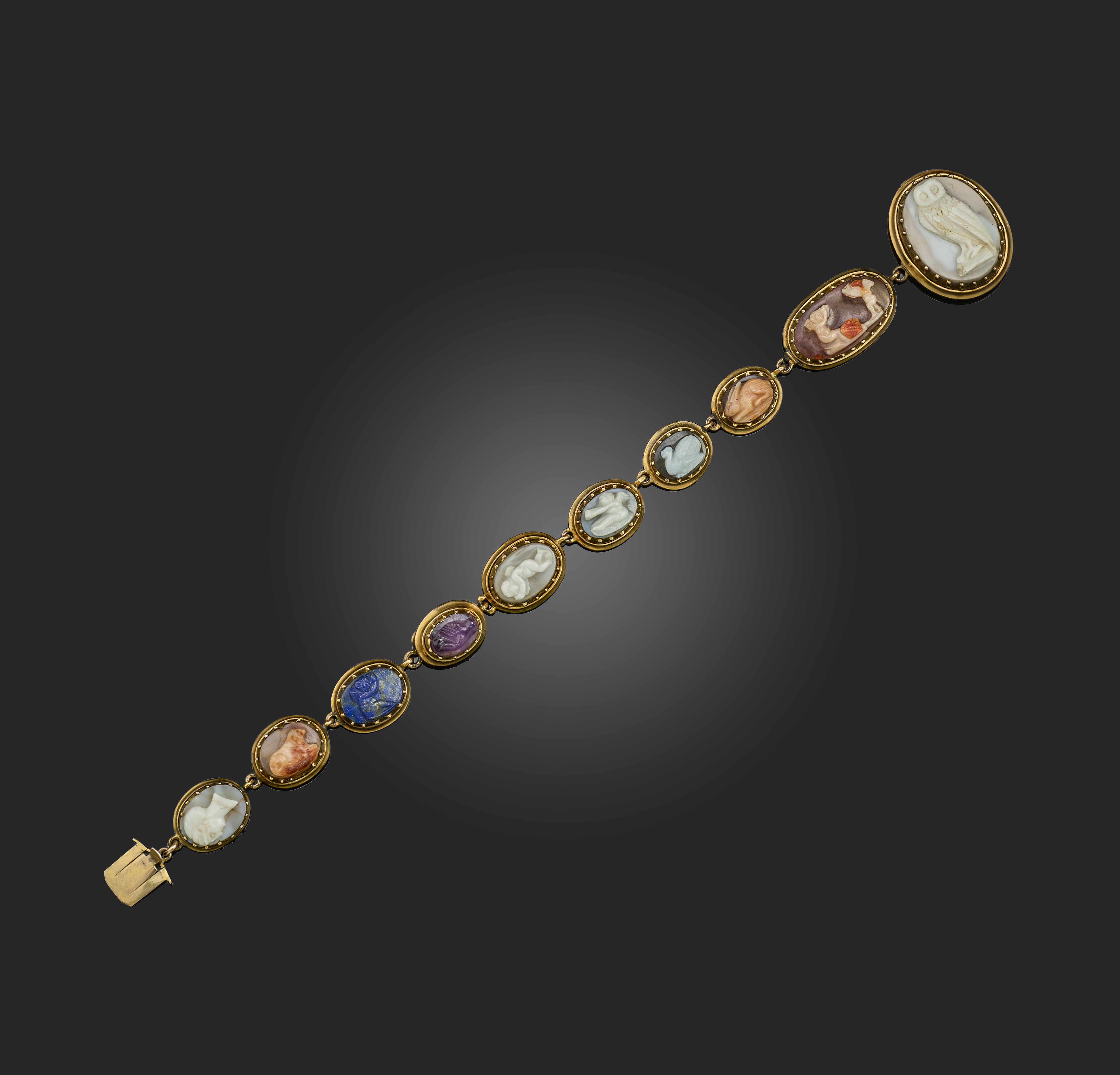 A hardstone cameo bracelet, late 18th/early 19th century, set with a sequence of cameos in gold collet settings, the cameos including: an owl in white agate; two putti in pinkish agate, depicted standing with raised arms, a basket in the foreground; a rabbit in pinkish agate; a swan in agate; two depictions of Cupid in grey onyx; a pair of clasped hands in amethyst; Cupid in lapis lazuli; a spaniel dog in pinkish jasper; and a classical woman in profile in grey agate, largest cameo 1.9 x 1.4cm, bracelet length 18cm