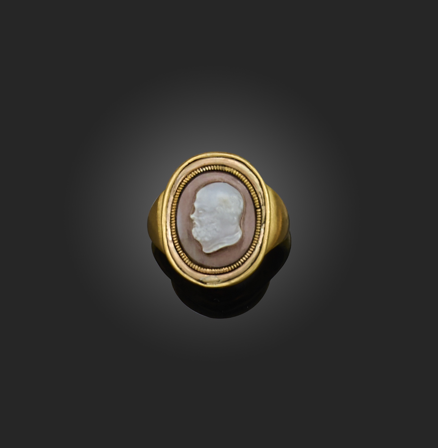 An agate cameo ring, early 19th century and later, set with an oval agate cameo carved with a bearded man in profile, probably Socrates, within a later gold border and ring mount, size M