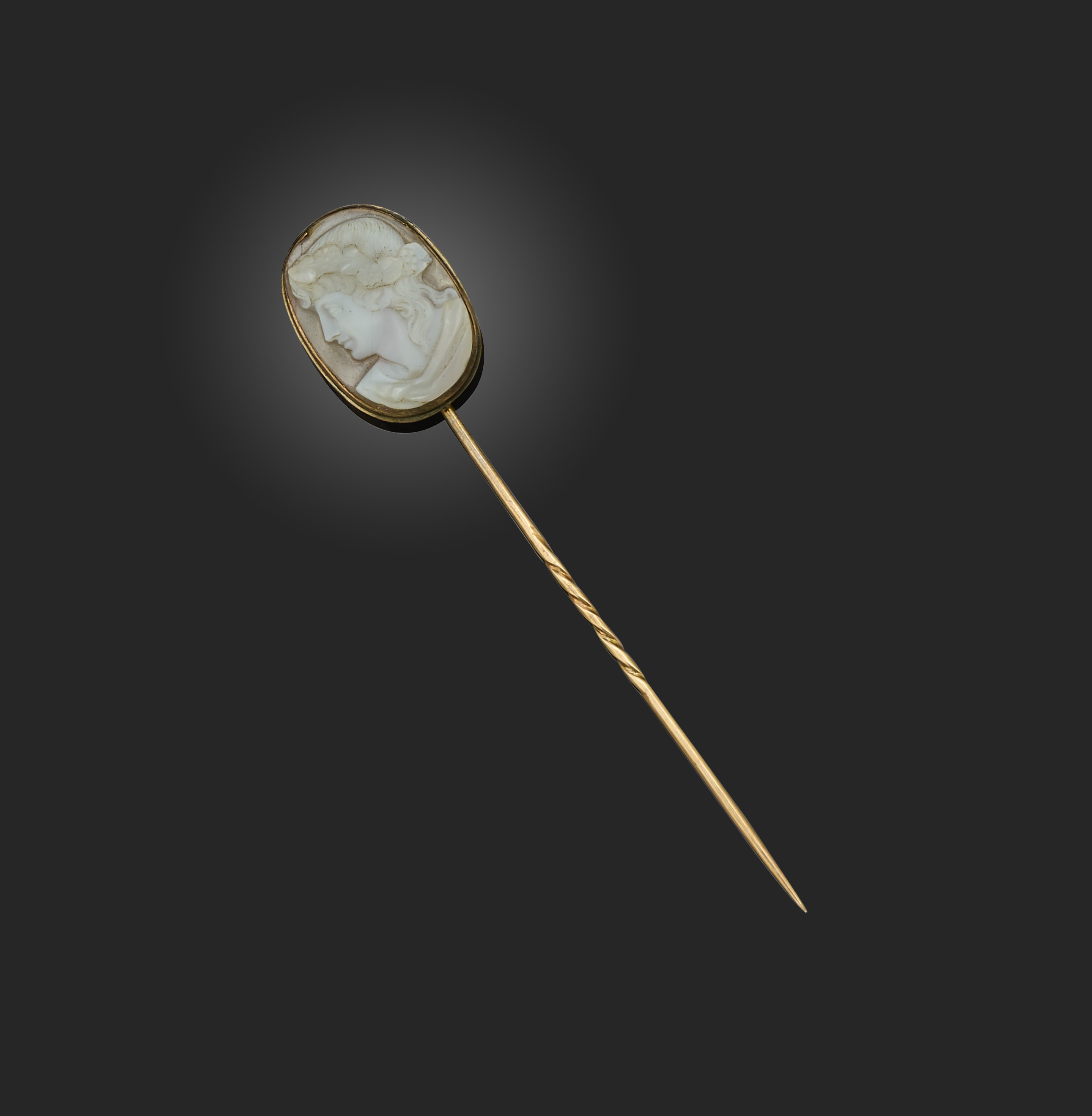 An agate cameo stick pin, 19th century, set with an oval agate cameo depicting a Bacchante, mounted