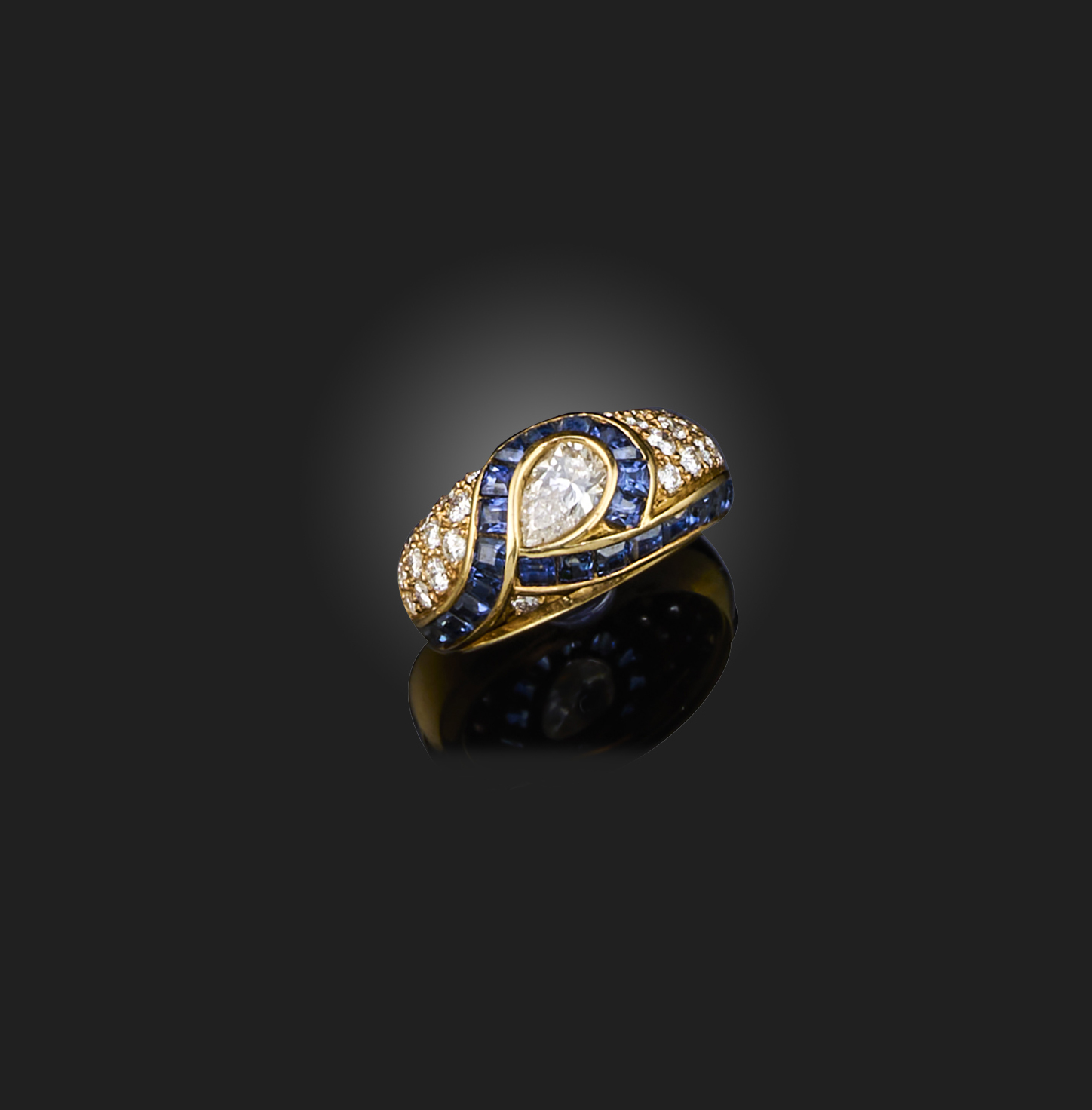 A sapphire and diamond ring, set with a pear-shaped diamond weighing approximately 0.50 carats to a gold mount pavé-set with brilliant-cut diamonds and channel-set with calibré-cut sapphires, size K1/2