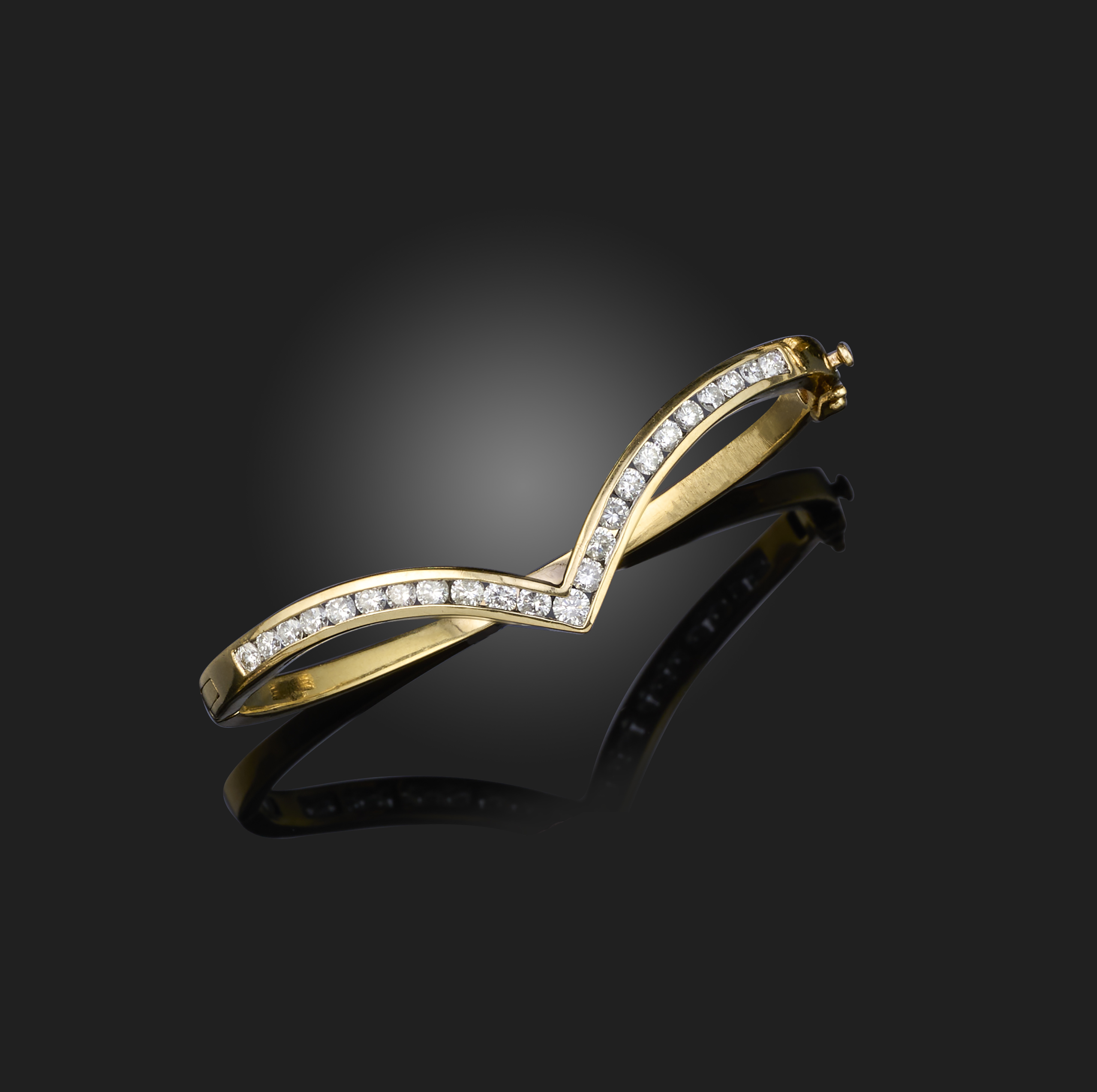 A gold and diamond bangle, of hinged construction, the front of V-shaped design channel-set with
