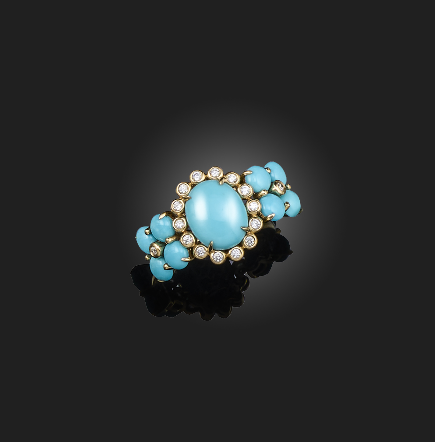 A turquoise and diamond ring, centring on a cluster set with a cabochon turquoise surrounded with