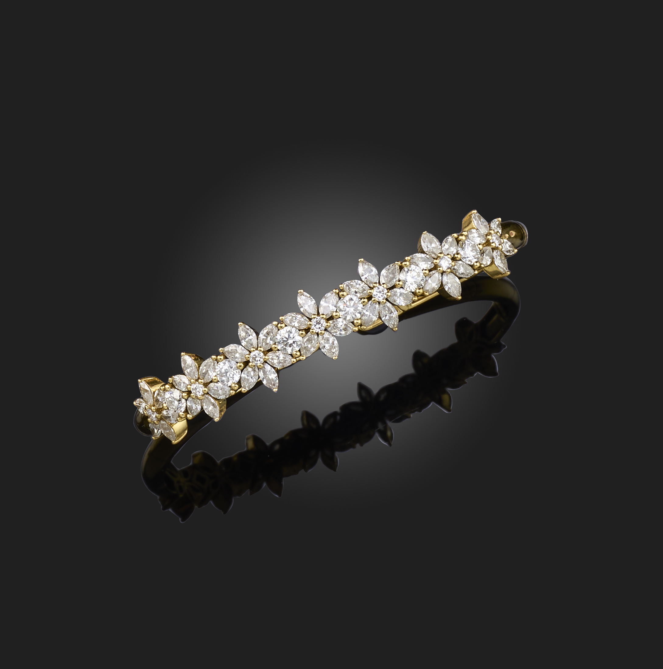 A diamond-set gold flower bangle, of interlocking floral design set with circular and marquise-shaped diamonds weighing 4.63cts on articulated yellow gold bangle, stamped 750 and D4.63, inner width 5.5cm