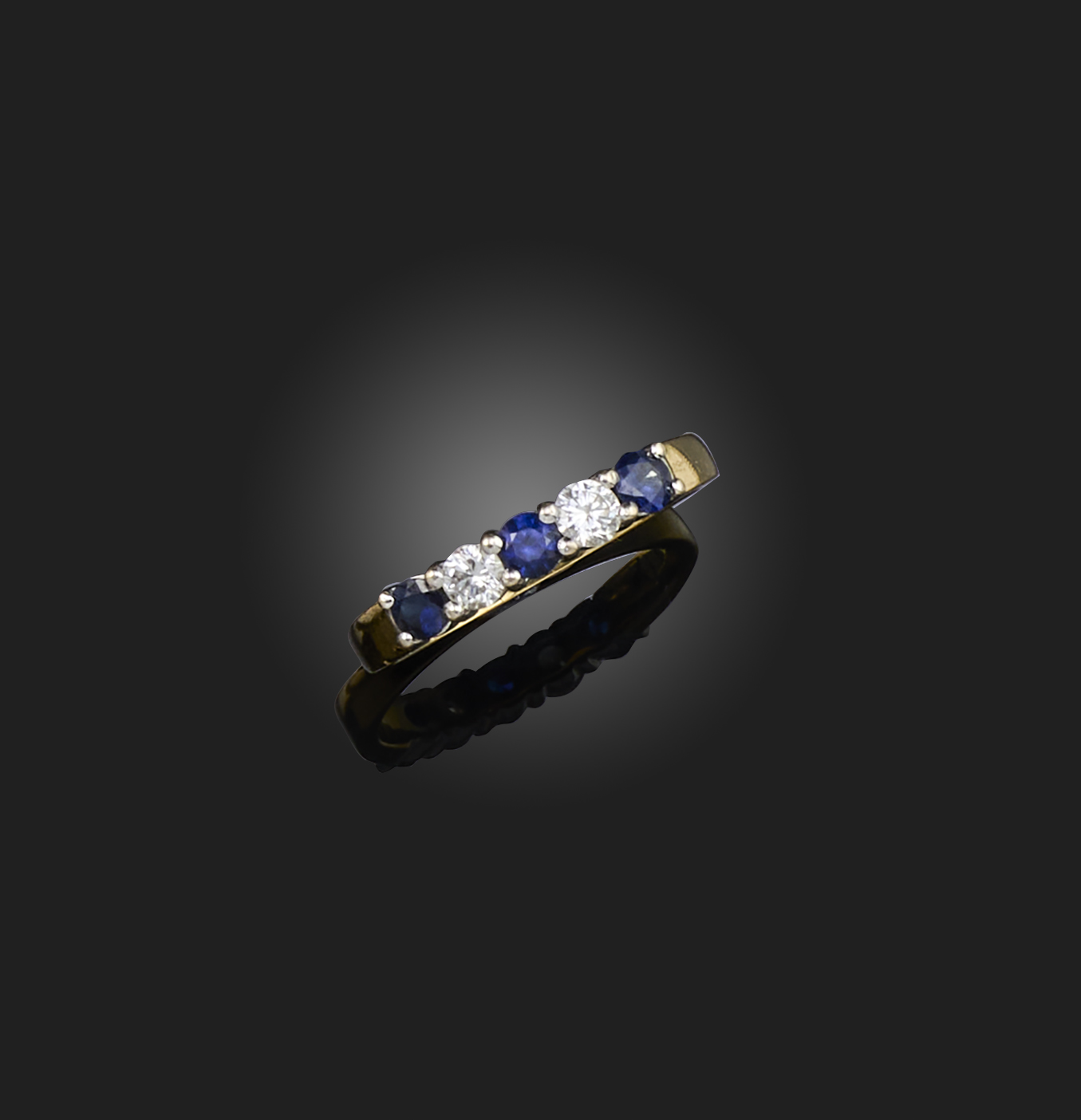 A sapphire and diamond five-stone ring, the three circular-cut sapphires and two brilliant-cut