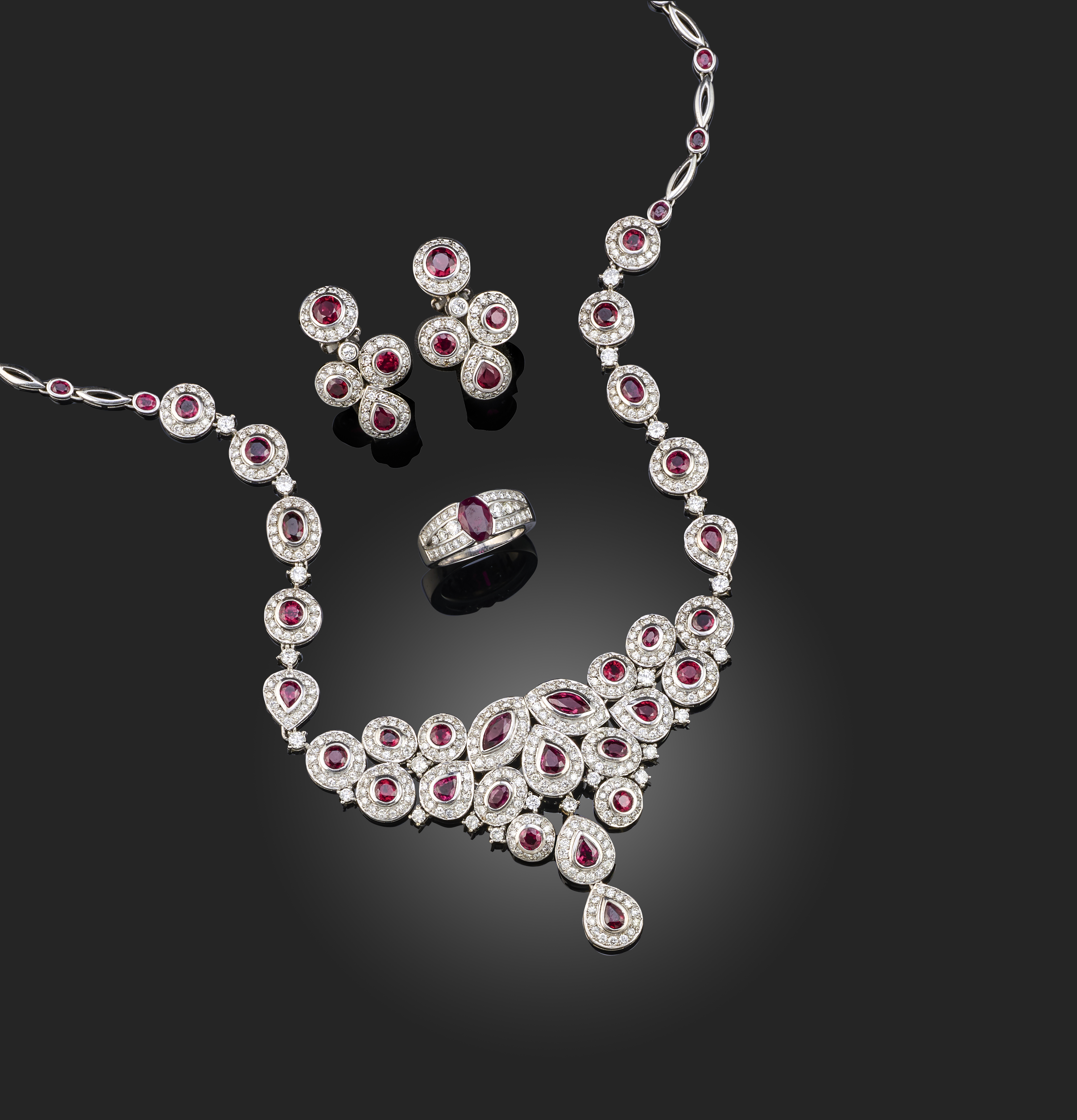 A ruby and diamond suite of jewellery, comprising a ruby and diamond ring by Romaine Herzo, the oval ruby set within diamond-set shoulders and gallery in white gold, French control marks and rubbed maker's mark, size M, with a ruby and diamond necklace, formed of graduated clusters of ruby and diamonds on a ruby chain in white gold, length 43cm, with a pair of matching ruby and diamond earrings in white gold, post and clip fittings, length 3.1cm
