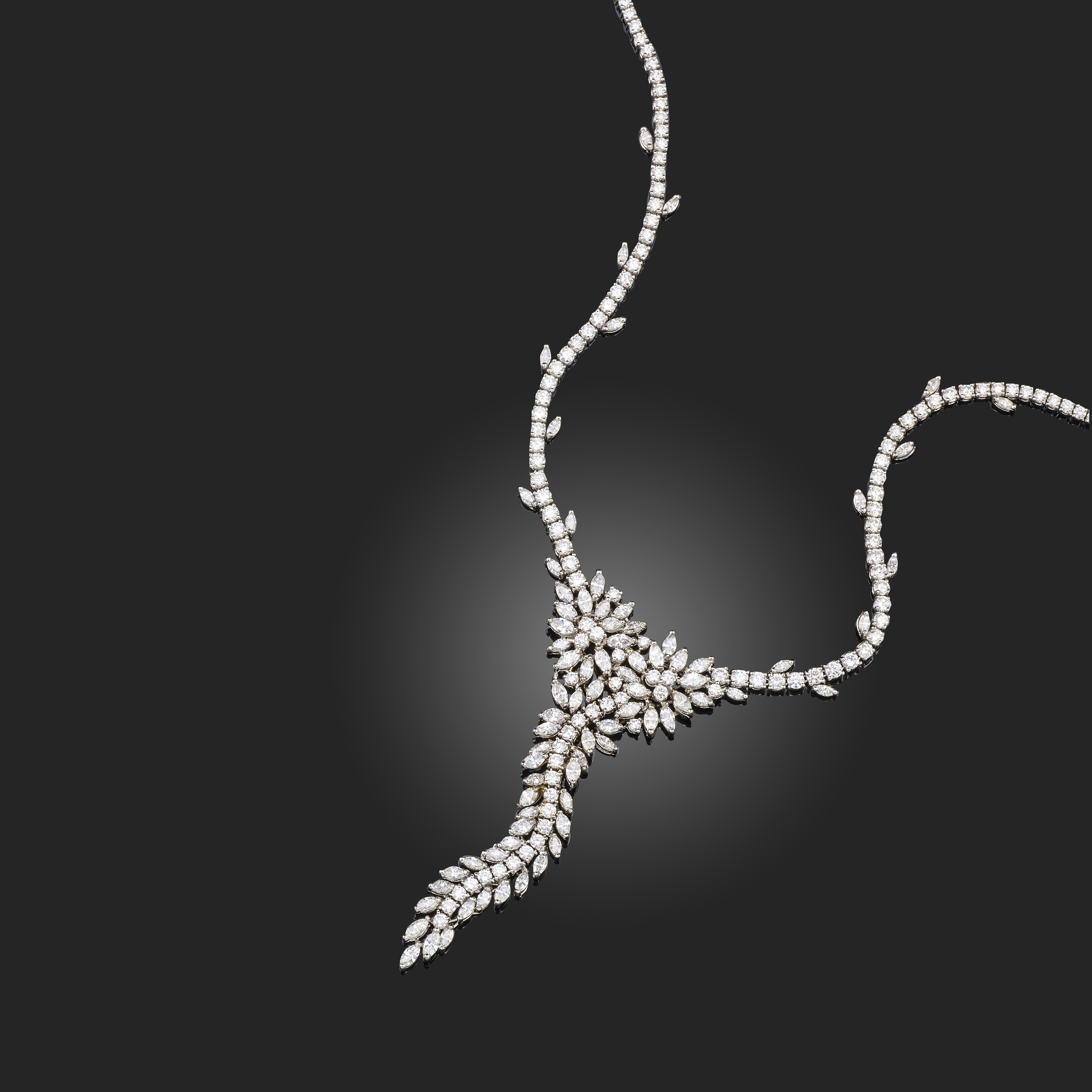 A diamond necklace, of abstract foliate design, set with brilliant-cut and marquise-shaped diamonds,