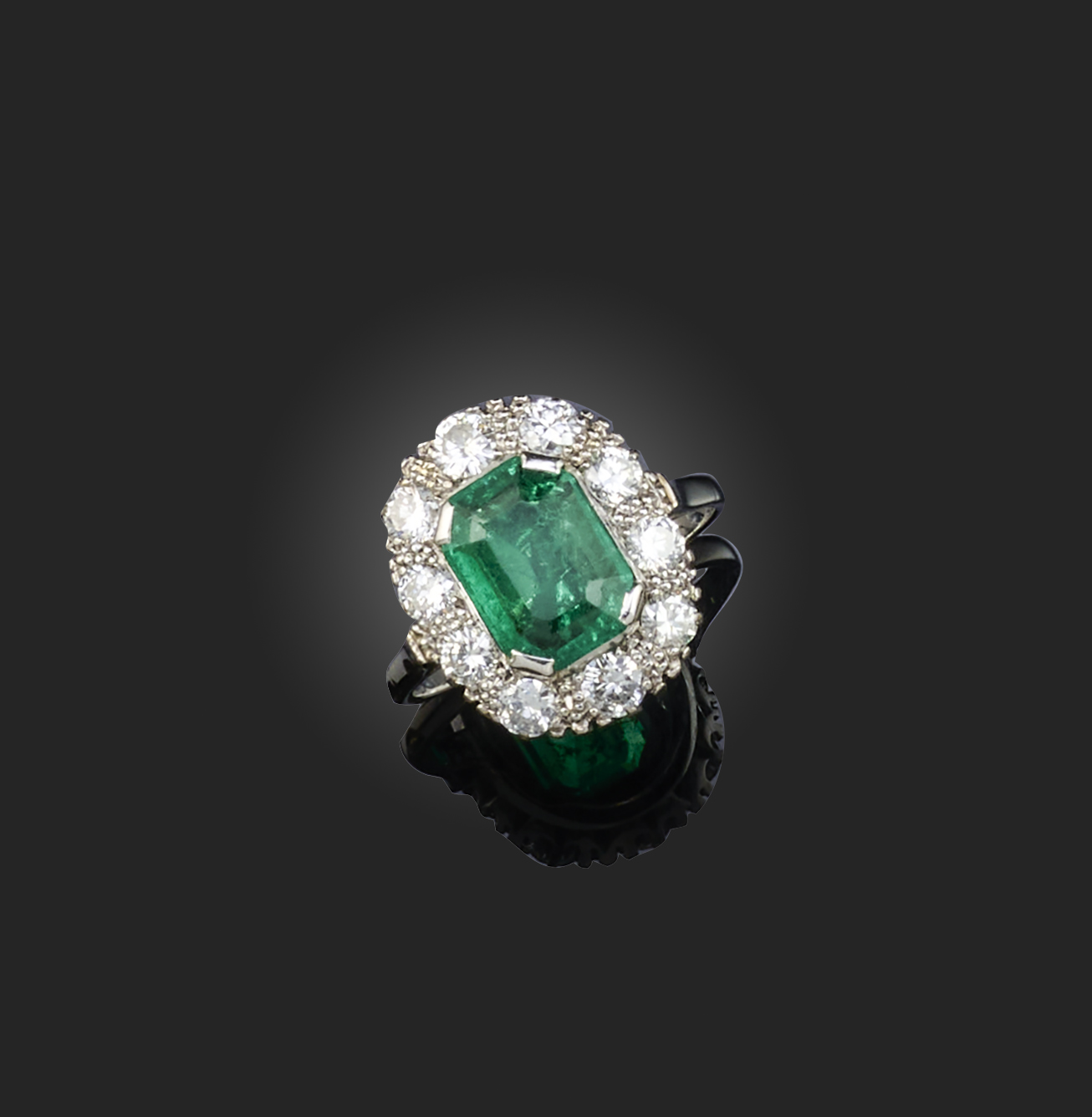 An emerald and diamond cluster ring, set with a step-cut emerald weighing approximately 2.20 carats,